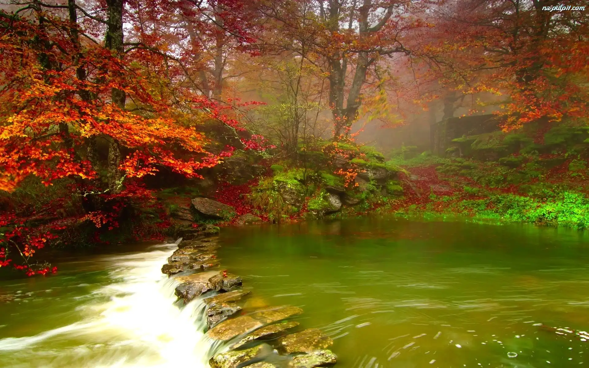 Liście, Woda, Zielona, Rzeka, Czerwone Na Pulpit