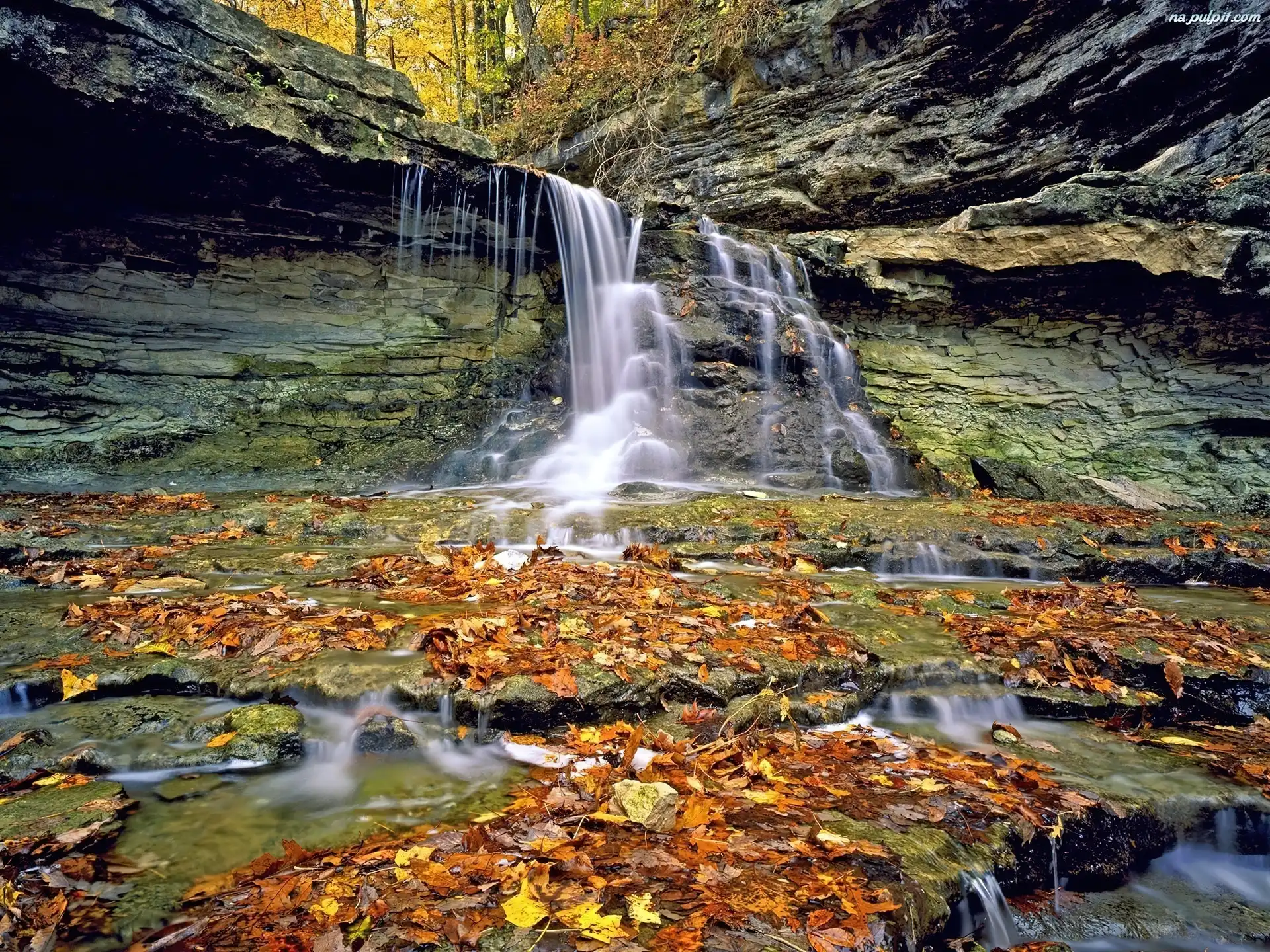 Liście, Wodospad, Skały, Żółte Na Pulpit