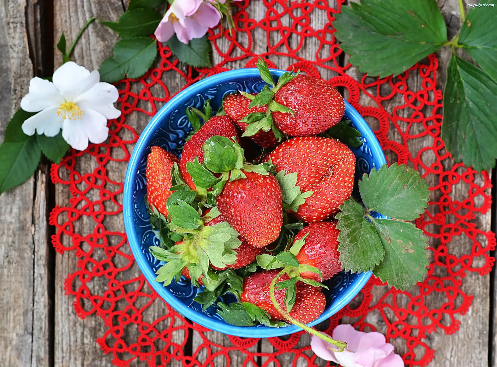 Liście, Deska, Kwiaty, Miska, Truskawki, Serwetka Na Pulpit