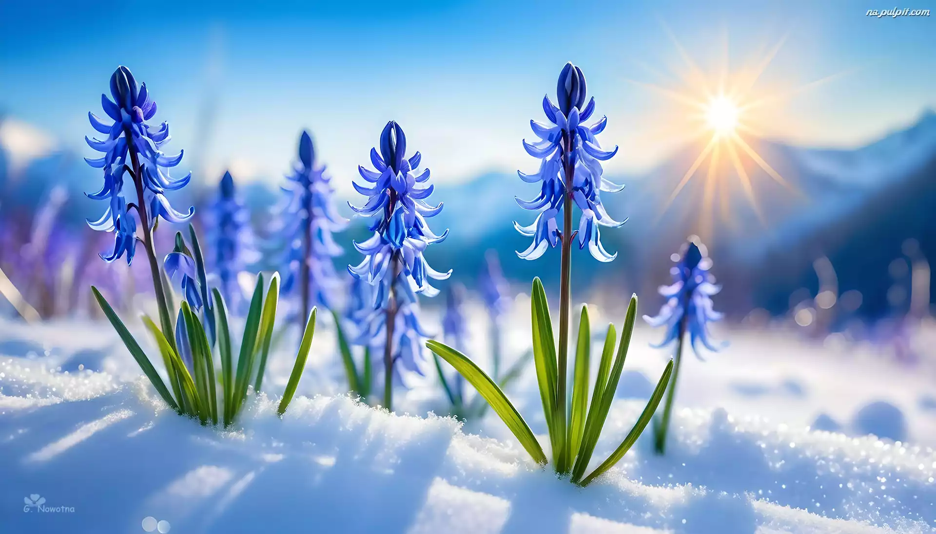 Śnieg, Niebieskie, Zielone, Listki, Kwiaty, Grafika Na Pulpit