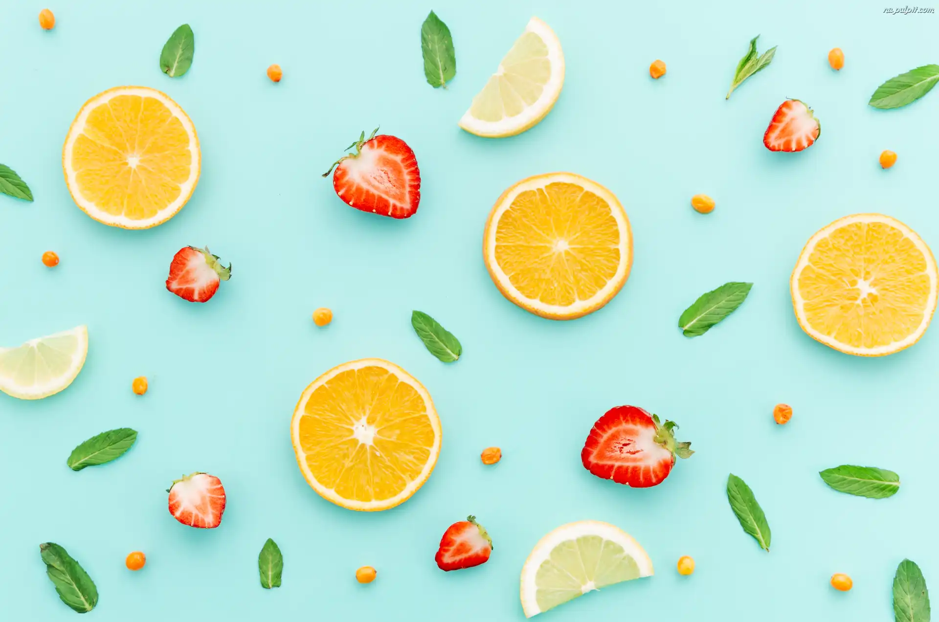 Listki.Mięty, Cytryny, Pomarańcze, Owoce, Truskawki