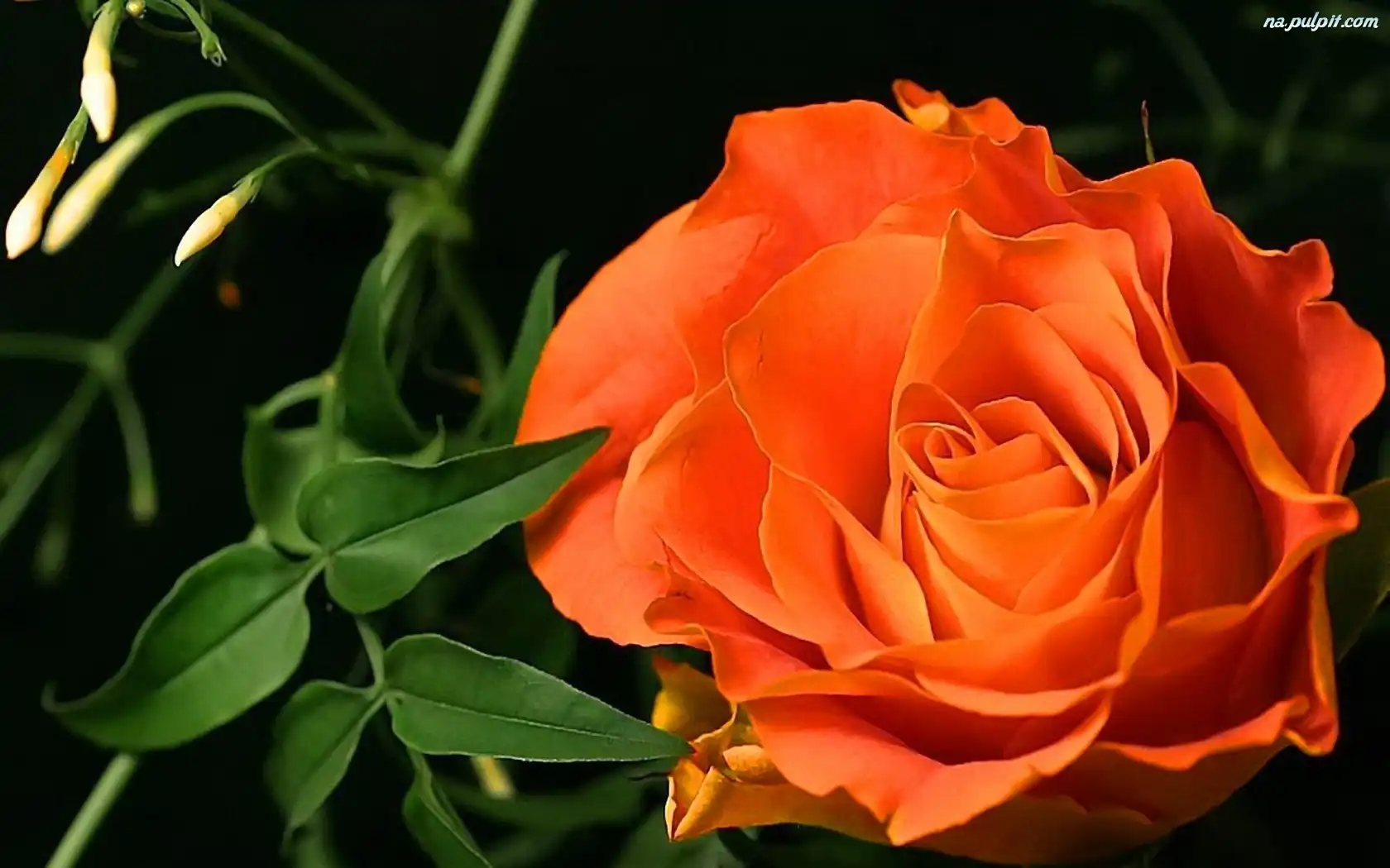 Listki, Róża, Pomarańczowa, Zielone Na Pulpit