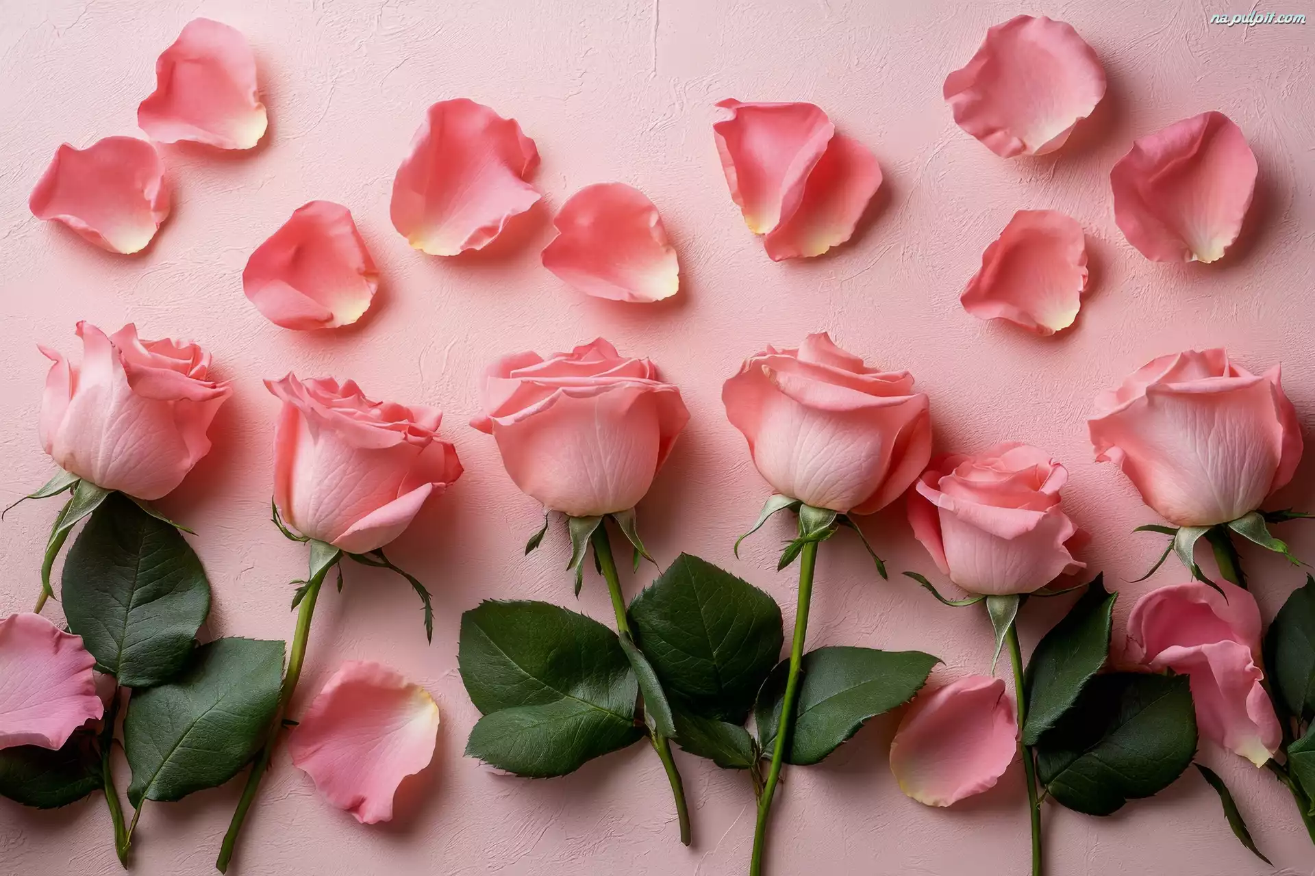 Różowe, Różowe, Płatki, Listki, Róże, Tło