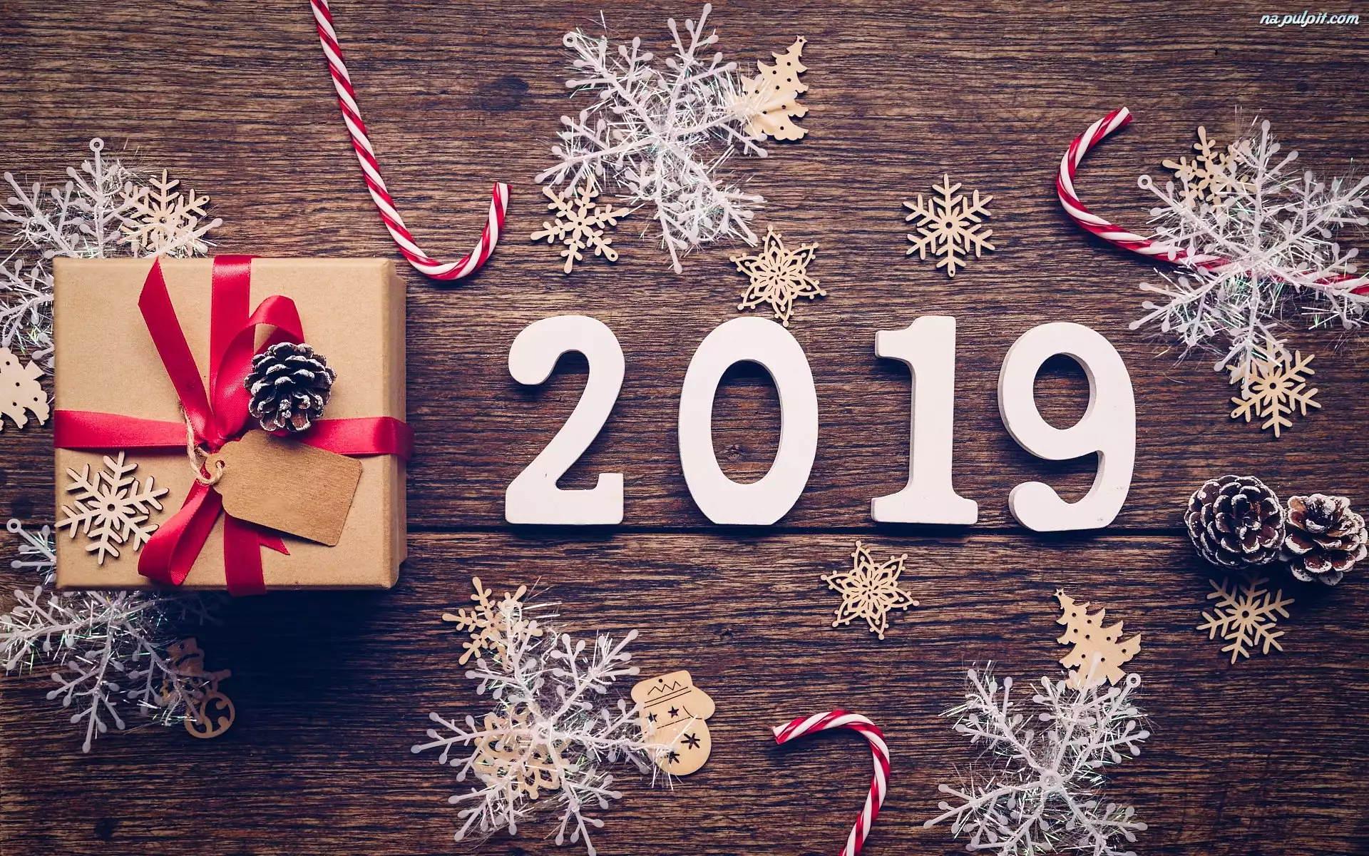 Szyszki, 2019, Nowy Rok, Prezent, Śnieżynki, Drewno, Ozdoby, Napis, Lizaki