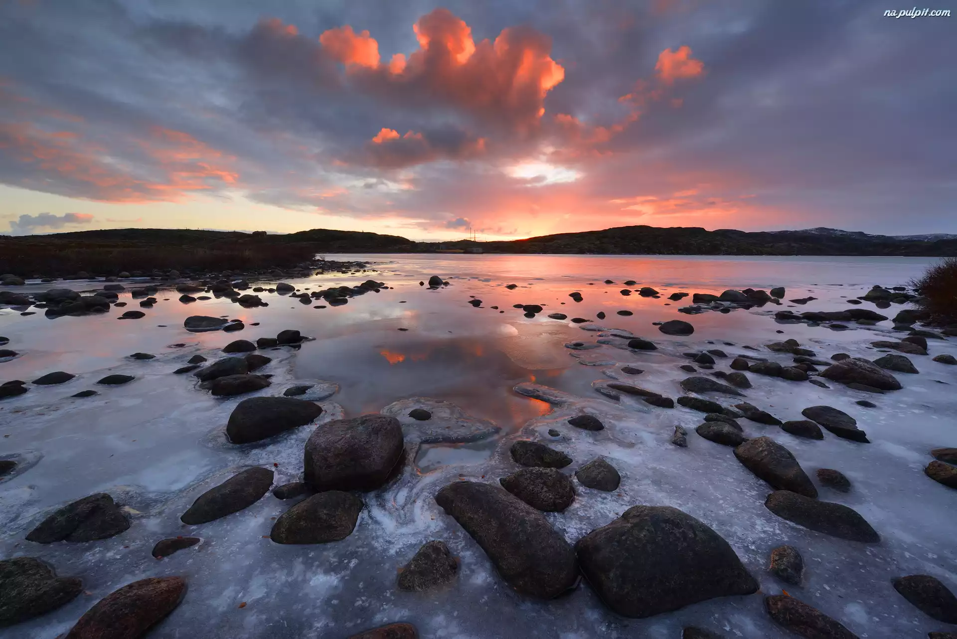 Teriberka, Kamienie, Lód, Obwód murmański, Rosja, Chmury, Jezioro Sekretarskoye, Zachód słońca Na Pulpit |