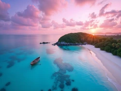 Łódka, Morze, Zachód słońca, Z lotu ptaka, Plaża, AI