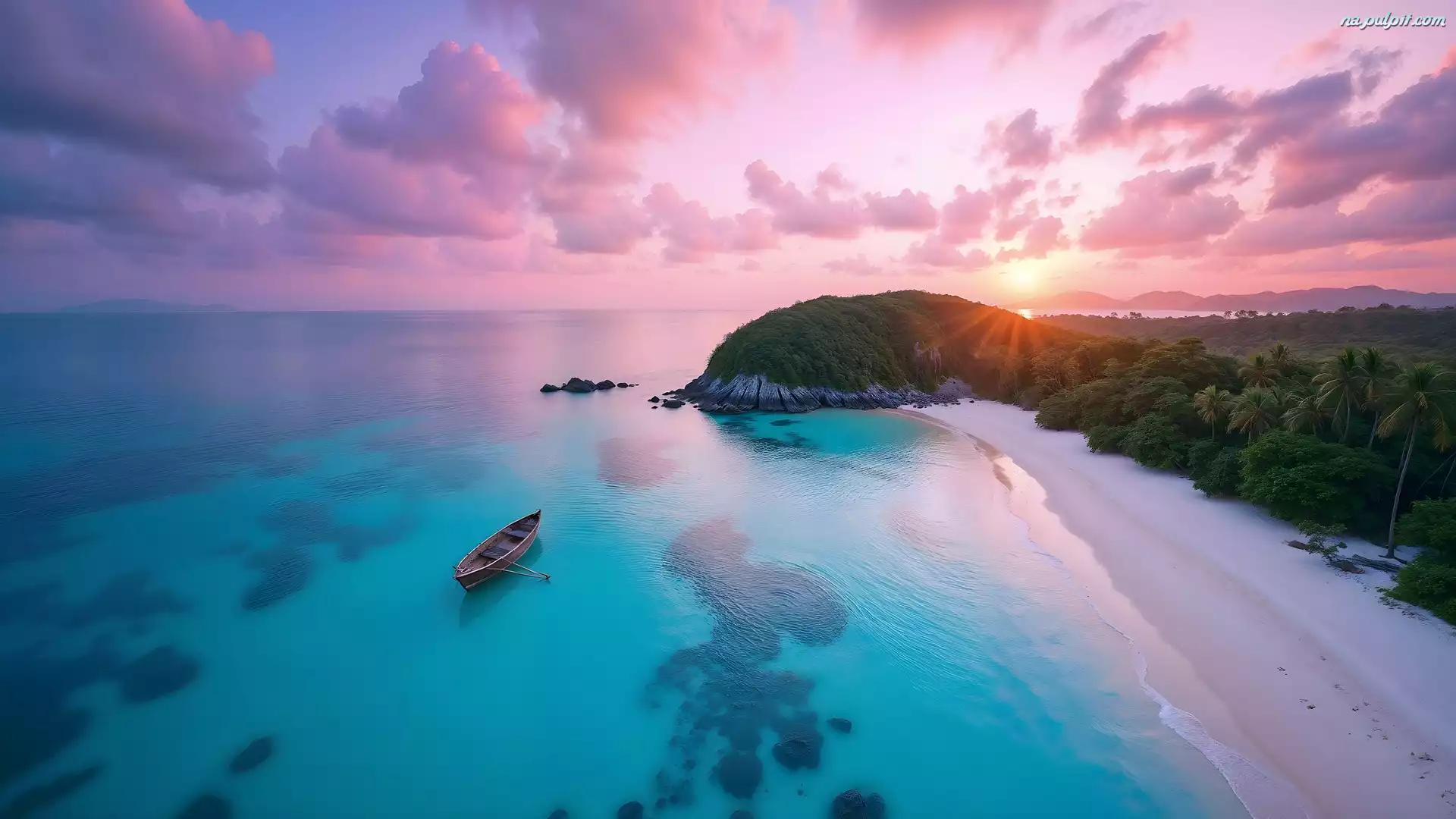 Łódka, Morze, Zachód słońca, Z lotu ptaka, Plaża, AI Na Pulpit