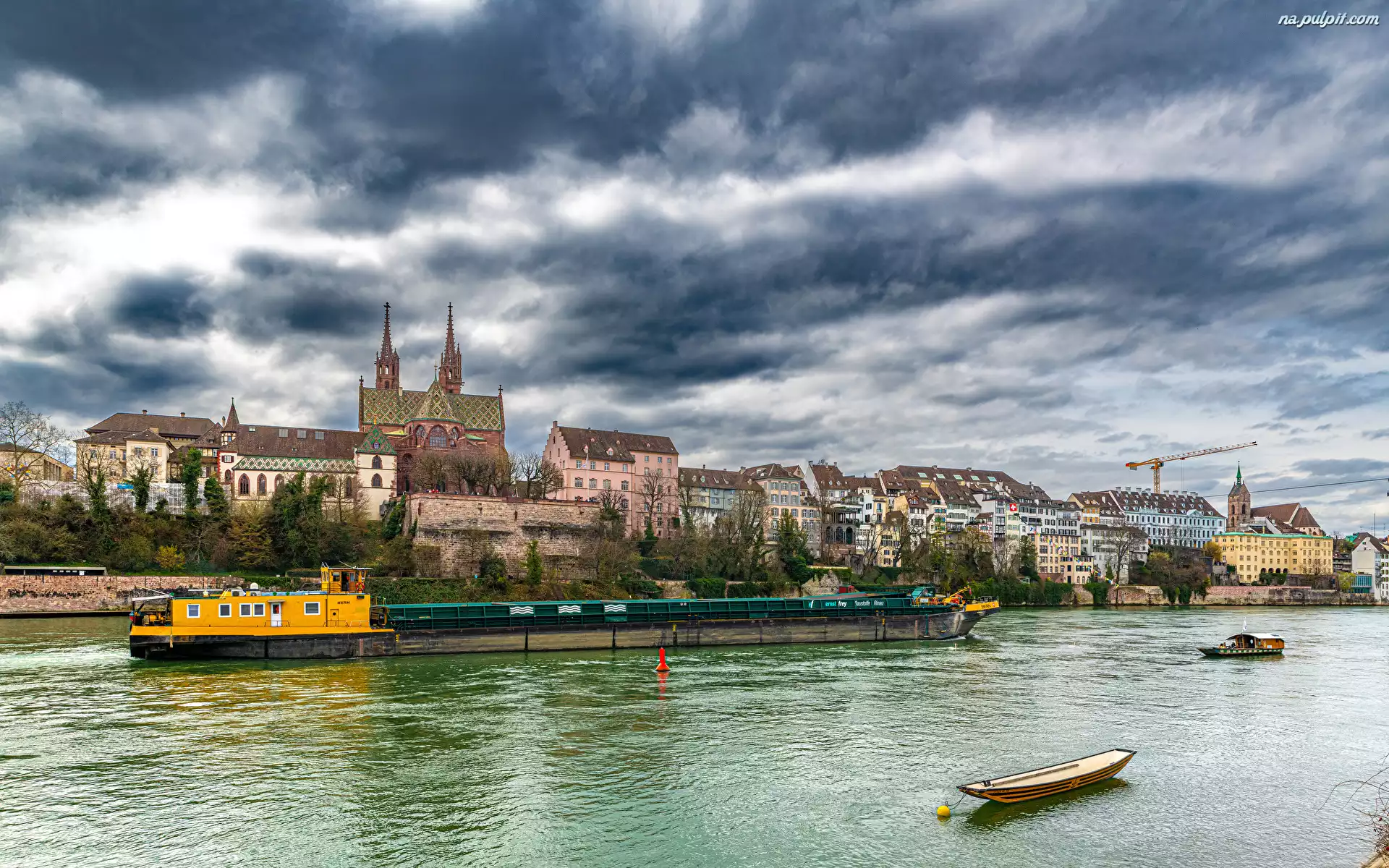 Domy, Barka, Żółta, Szwajcaria, Bazylea, Rzeka Ren, Łódki Na Pulpit