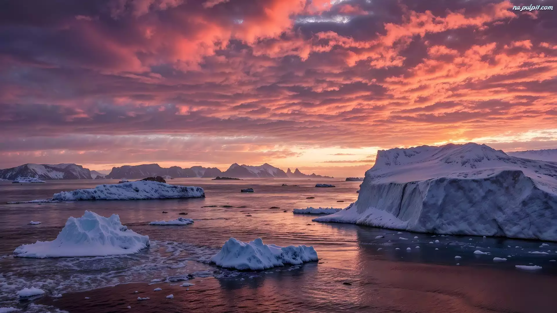 Niebo, Morze, Góry lodowe, Zachód słońca, Kolorowe Na Pulpit