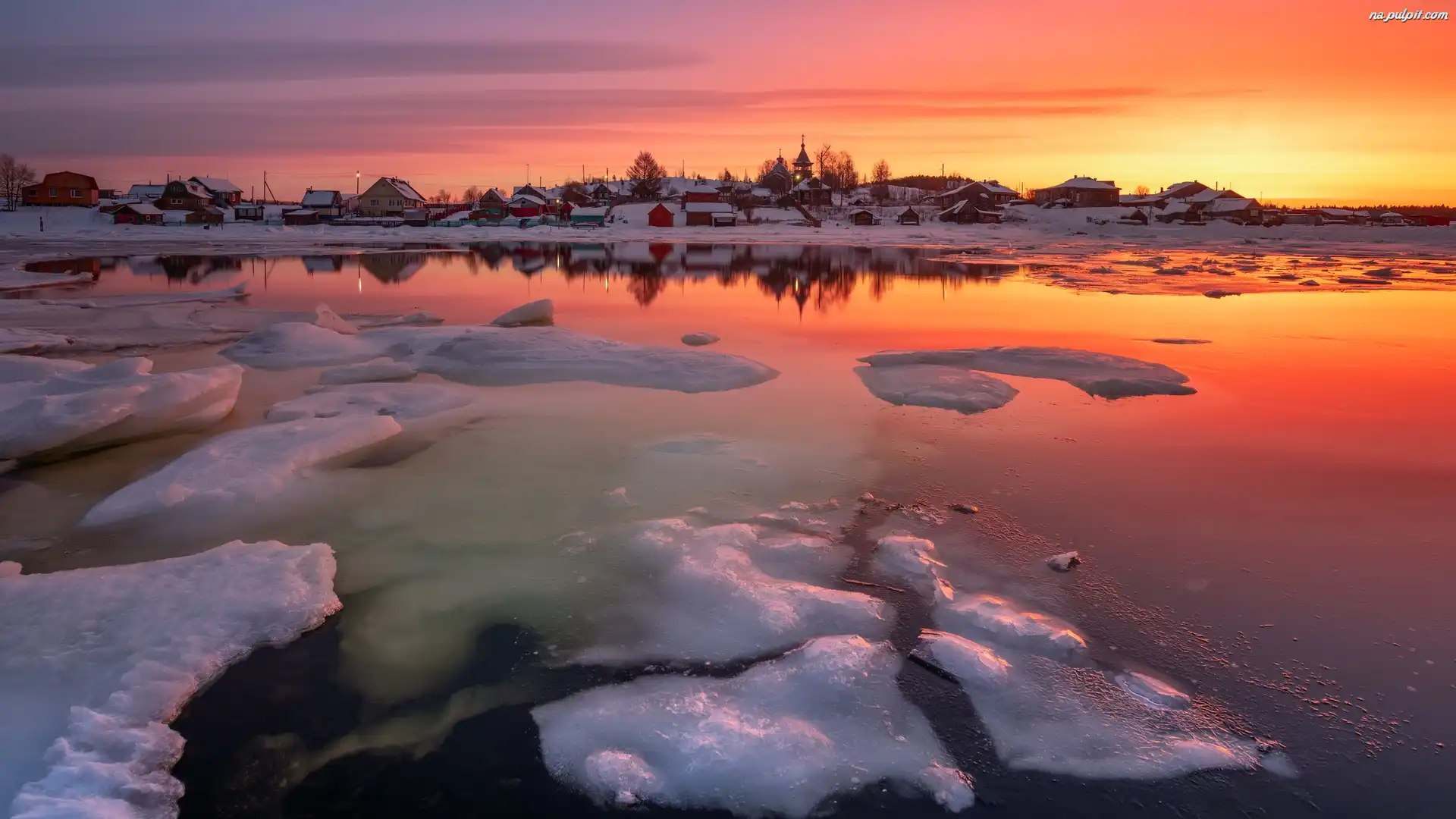 Rzeka, Wieś Kowda, Niebo, Rosja, Kry lodowe, Kolorowe, Obwód murmański, Zima Na Pulpit