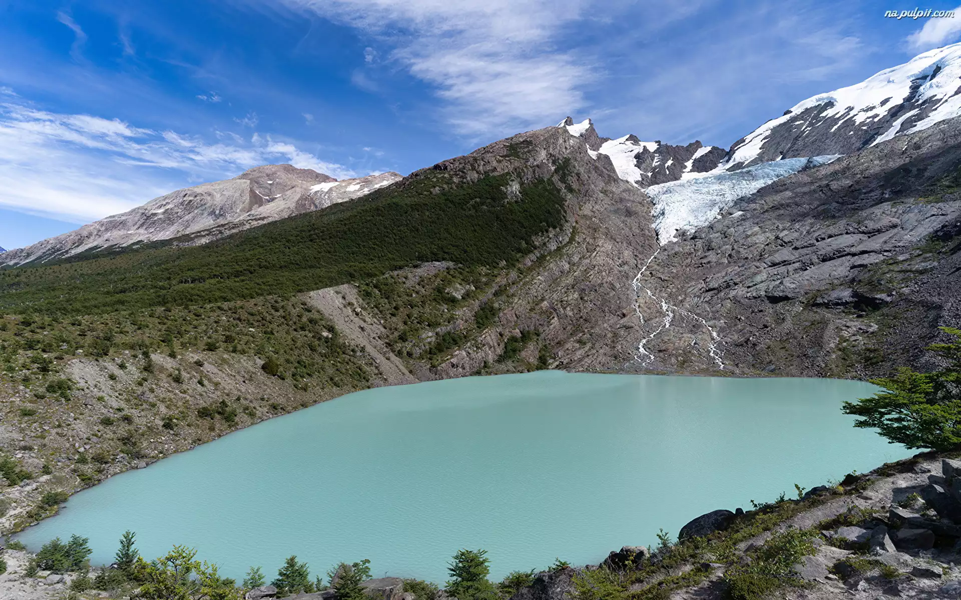 Śnieg, Niebo, Prowincja Santa Cruz, Lago del Desierto, Lodowiec, Jezioro, Argentyna, Góry, Huemul Glacier Na Pulpit |