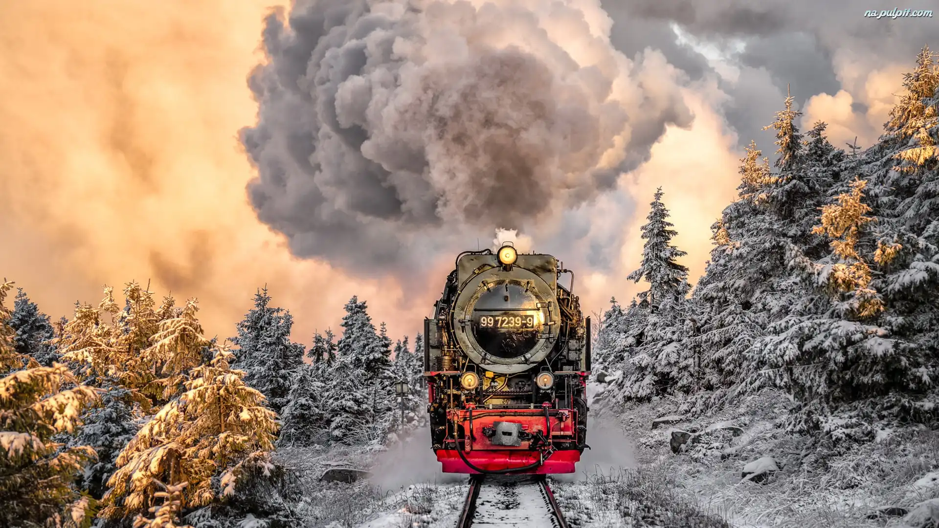 Lokomotywa parowa, Zima, Drzewa, Pociąg, Ośnieżone, Chmury
