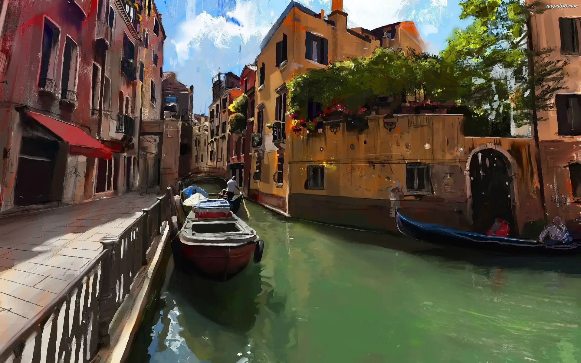 Christian Lonsdale, Wenecja, Włochy, Łodzie, Domy, Obraz, Gondola