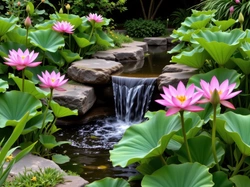 Liście, Różowe, Kaskada, Ogród, Rośliny, Kamienie, Kwiaty, Lotosy