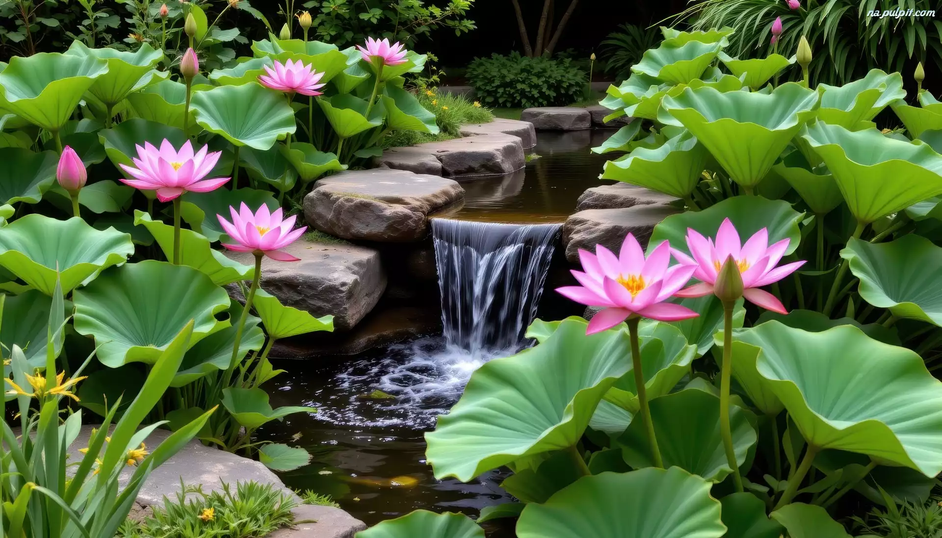 Liście, Różowe, Kaskada, Ogród, Rośliny, Kamienie, Kwiaty, Lotosy Na Pulpit