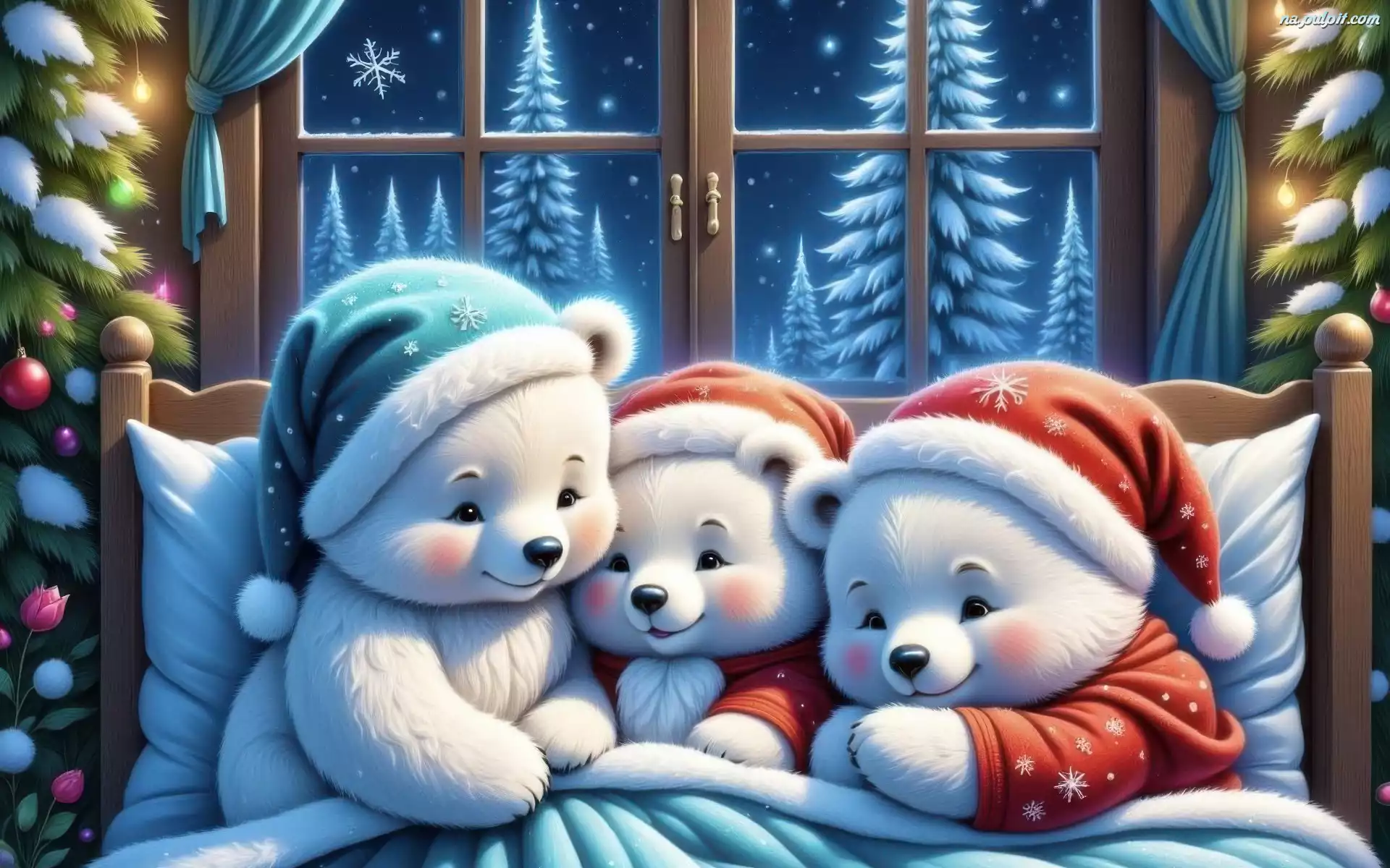 Choinki, Czapki, Okno, Trzy, AI, Zima, Misie, Łóżko