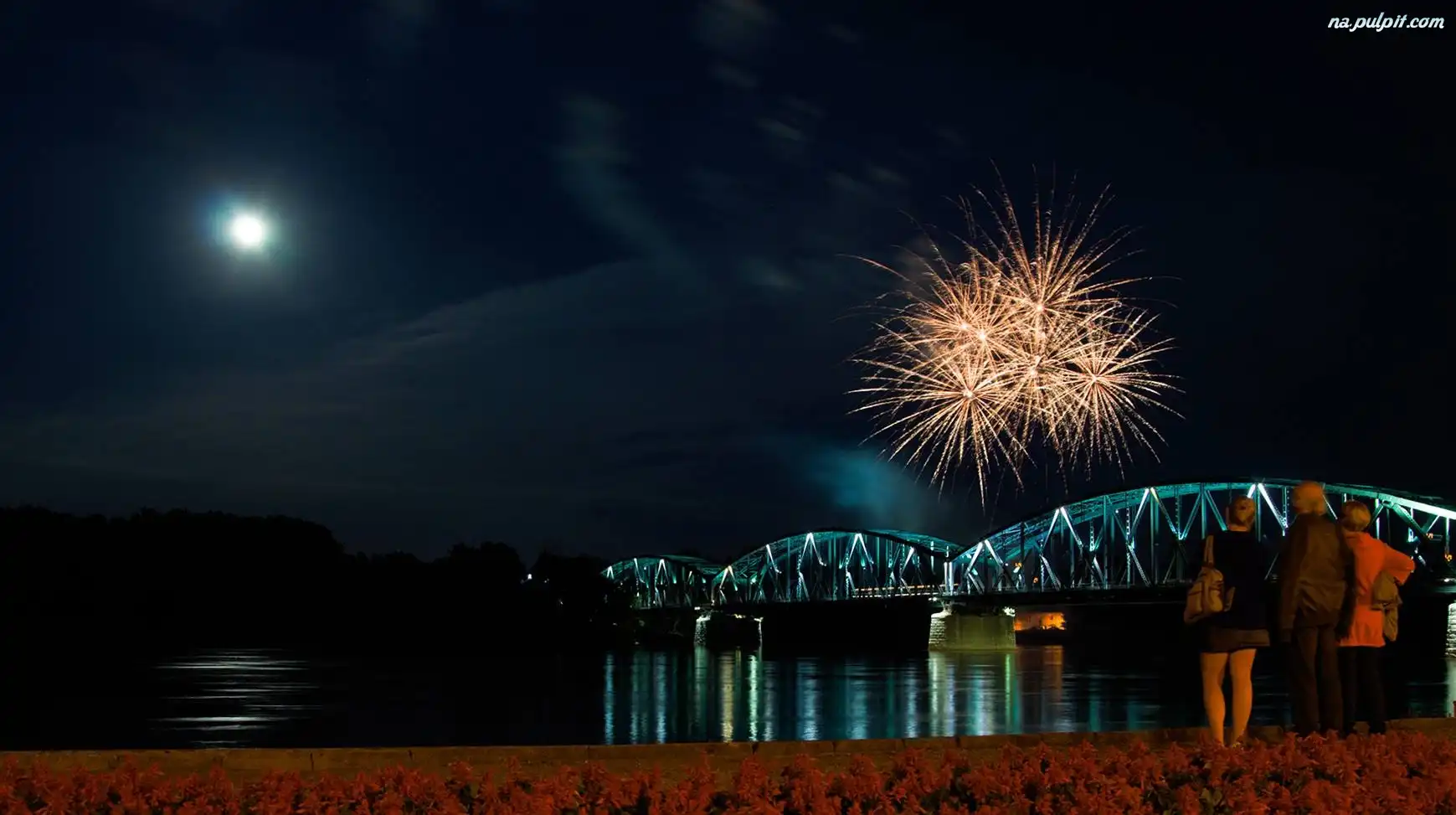 Ludzie, Rzeka, Most, Fajerwerki Na Pulpit