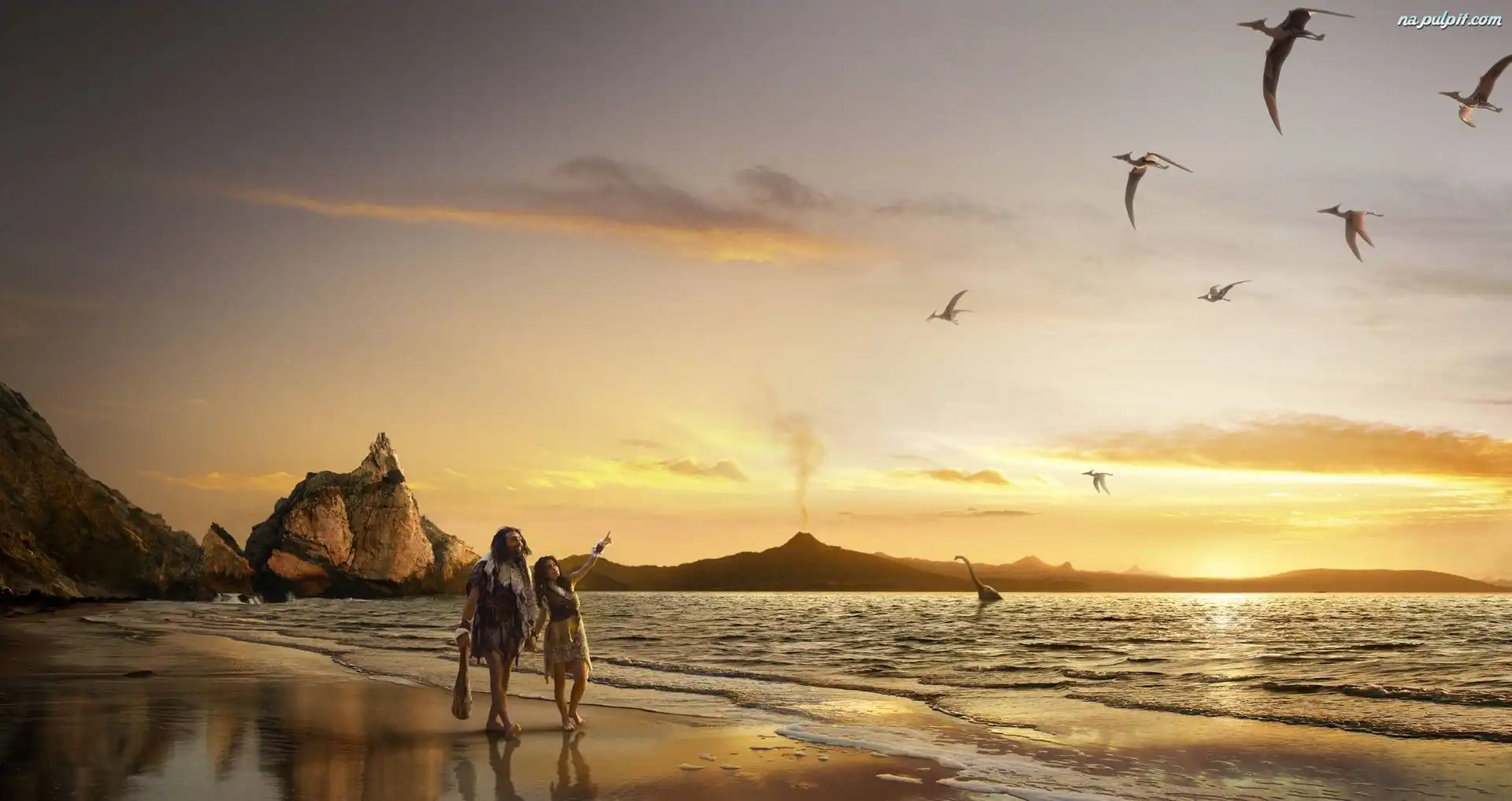 Ludzie, Plaża, Morze, Ptaki, Skały Na Pulpit
