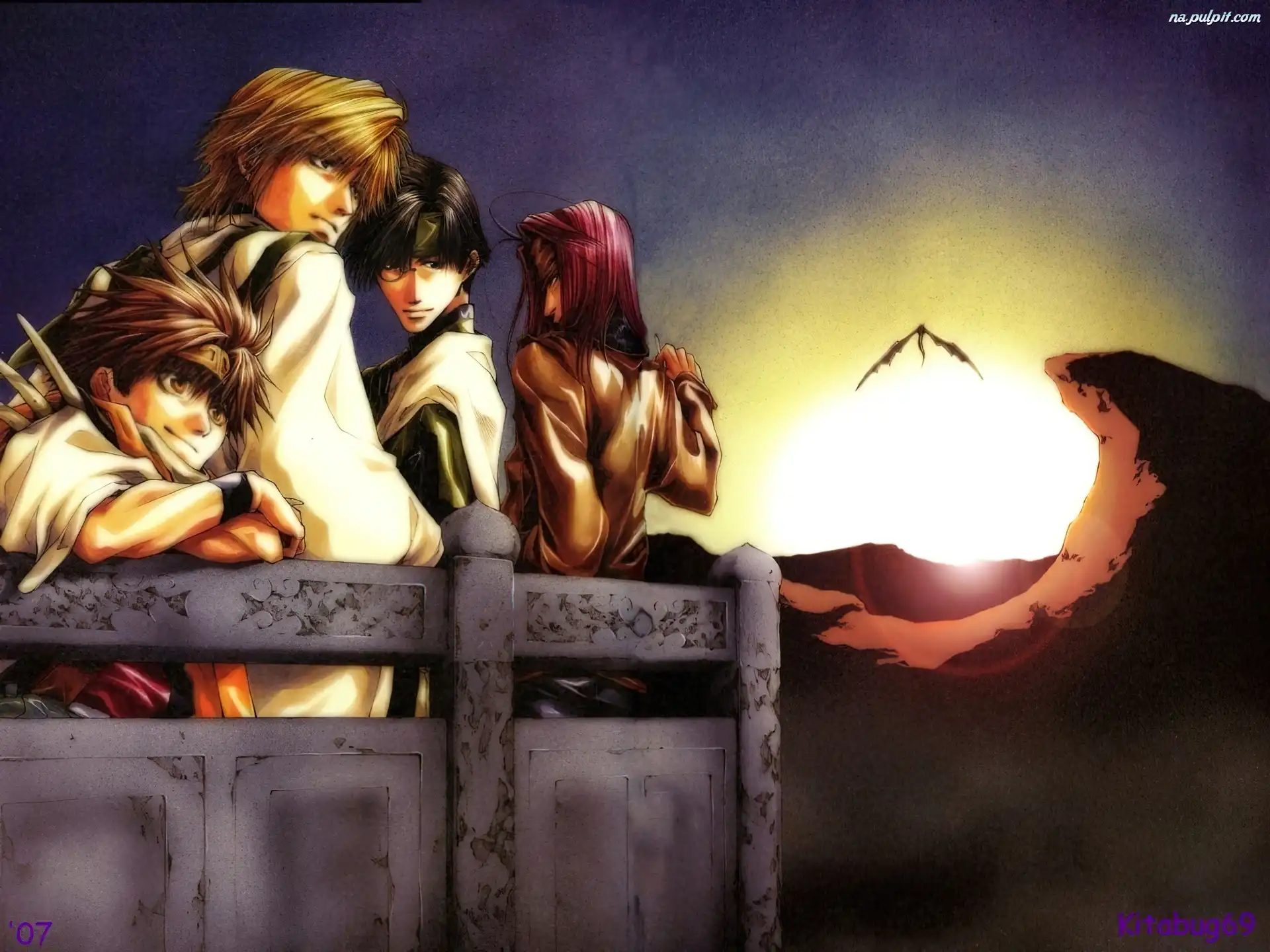 ludzie, ptak, Saiyuki, słońce Na Pulpit