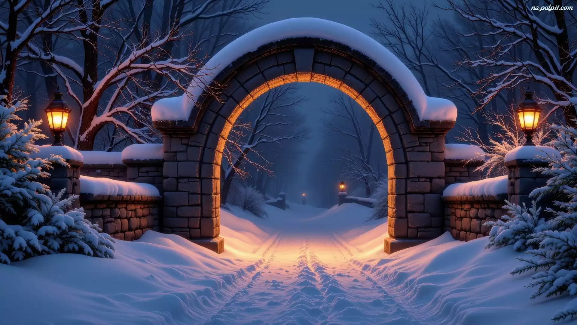 Latarnie, Brama, Droga, Noc, AI, Drzewa, Zima, Łuk Na Pulpit