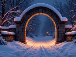 Latarnie, Brama, Droga, Noc, AI, Drzewa, Zima, Łuk