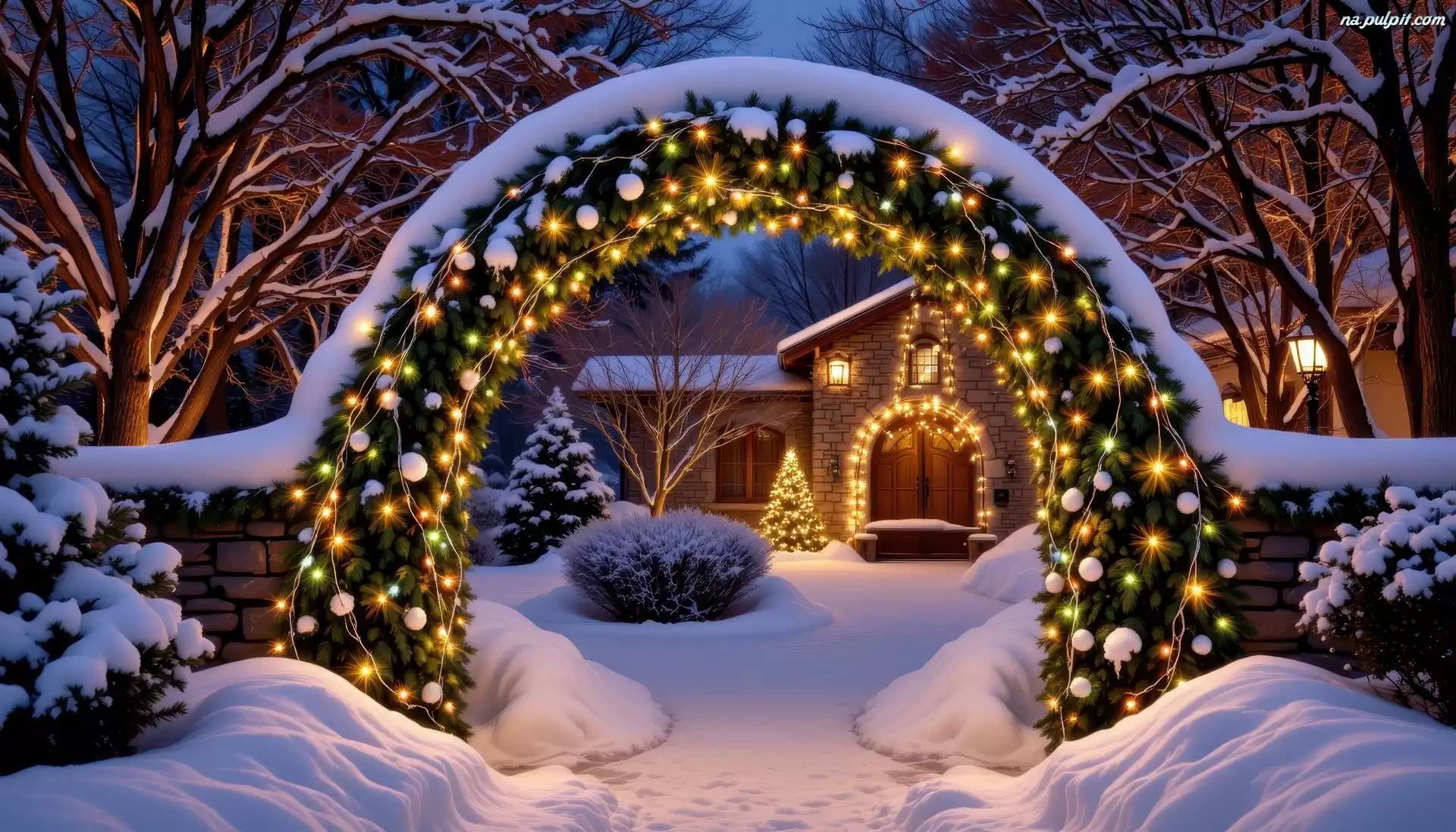 Łuk, Dom, Oświetlenie, Boże Narodzenie, Zaspy, Drzewa, Zima, Dekoracja Na Pulpit