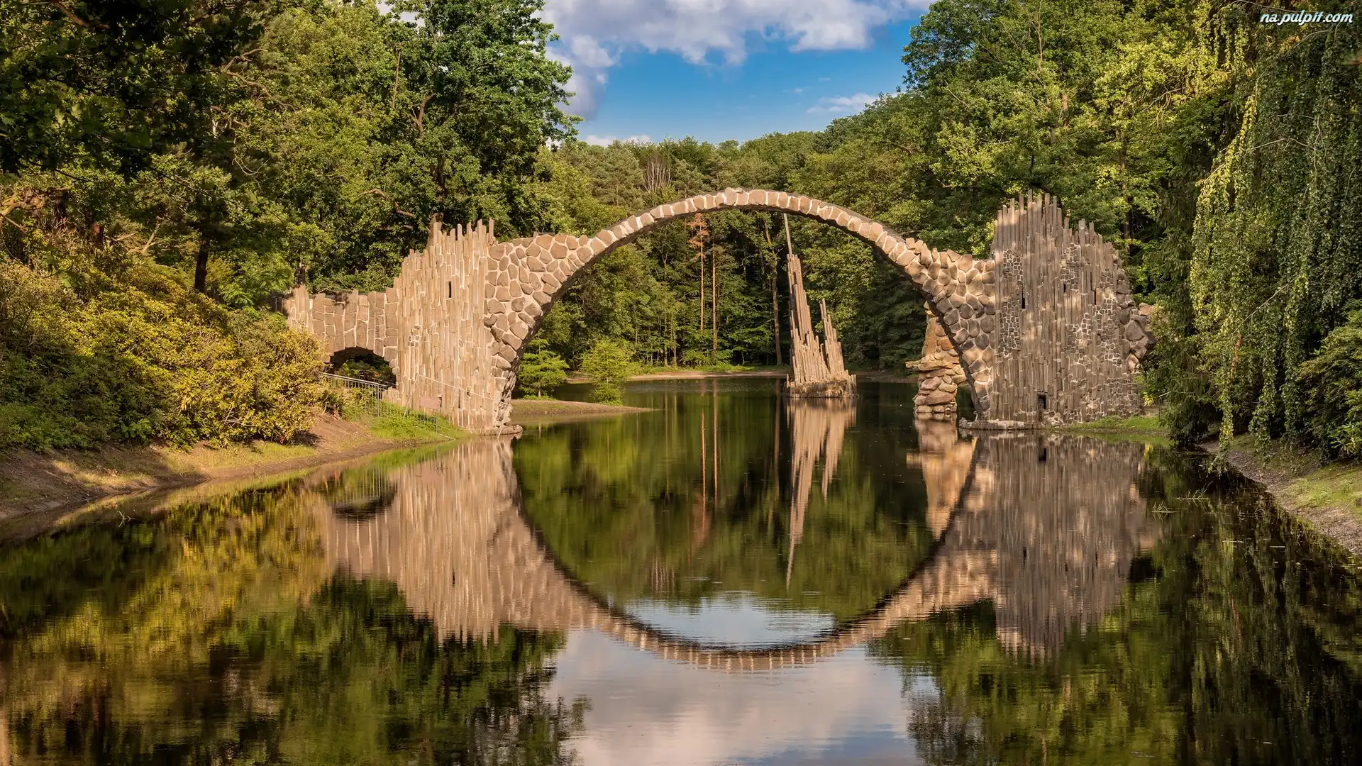 Odbicie, Most łukowy, Park Rododendronów Kromlau, Niemcy, Jezioro Rakotz, Kamienny, Saksonia Na Pulpit |