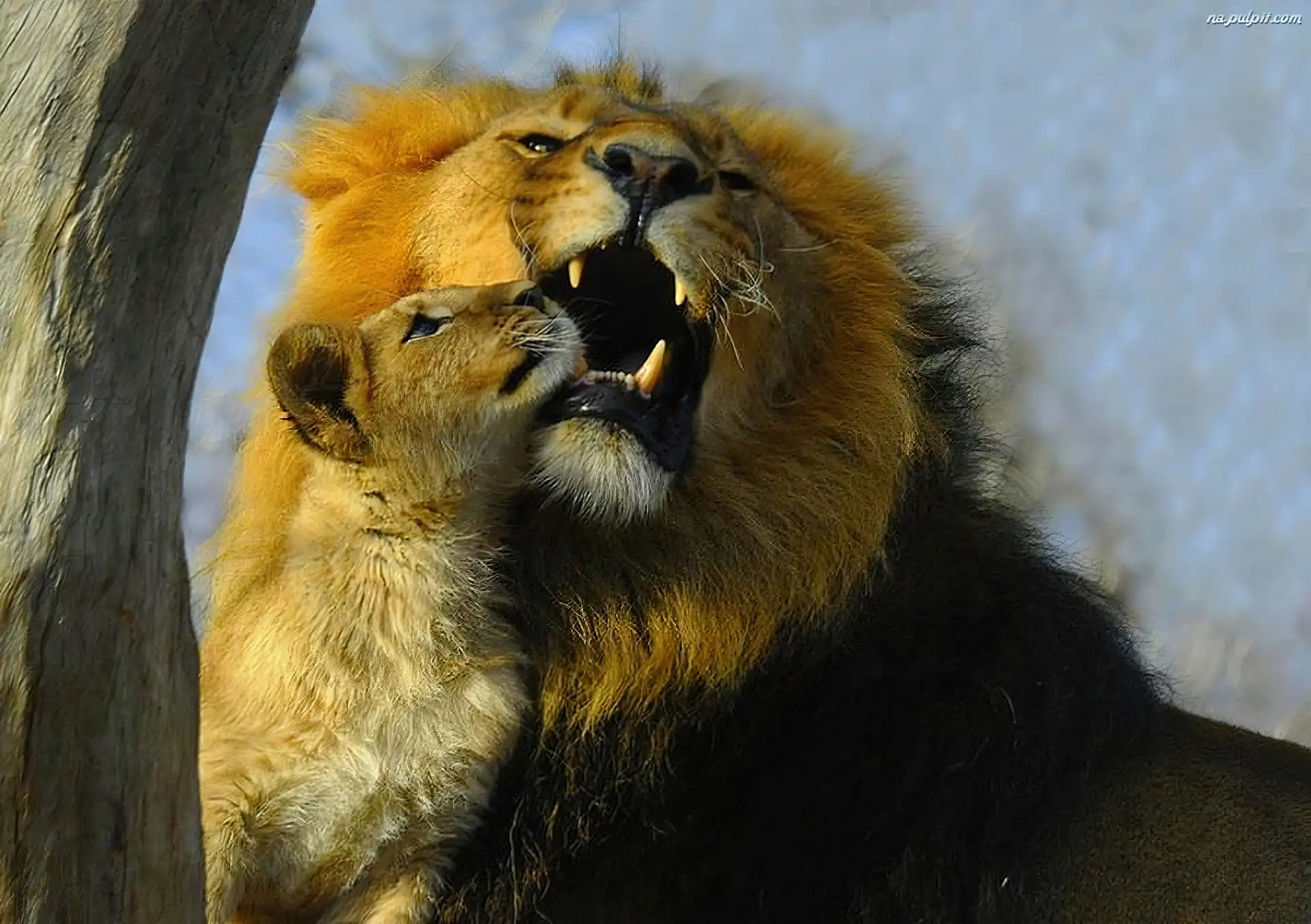 Lew, Głowa para, Lew, lwica Drzewo, Jesień Lwiątko na drzewie Drzewa, Jesień, Las Palma, Słońca, Zachód, Jacht Most, Palmy, Rzeka Wodospad Drzewa Trzy Drzewa Dwie, Lwice Dziewczynka, Śpiący, Lew Lwy Morze, Drzewo, Skała Małe Lwiątko
