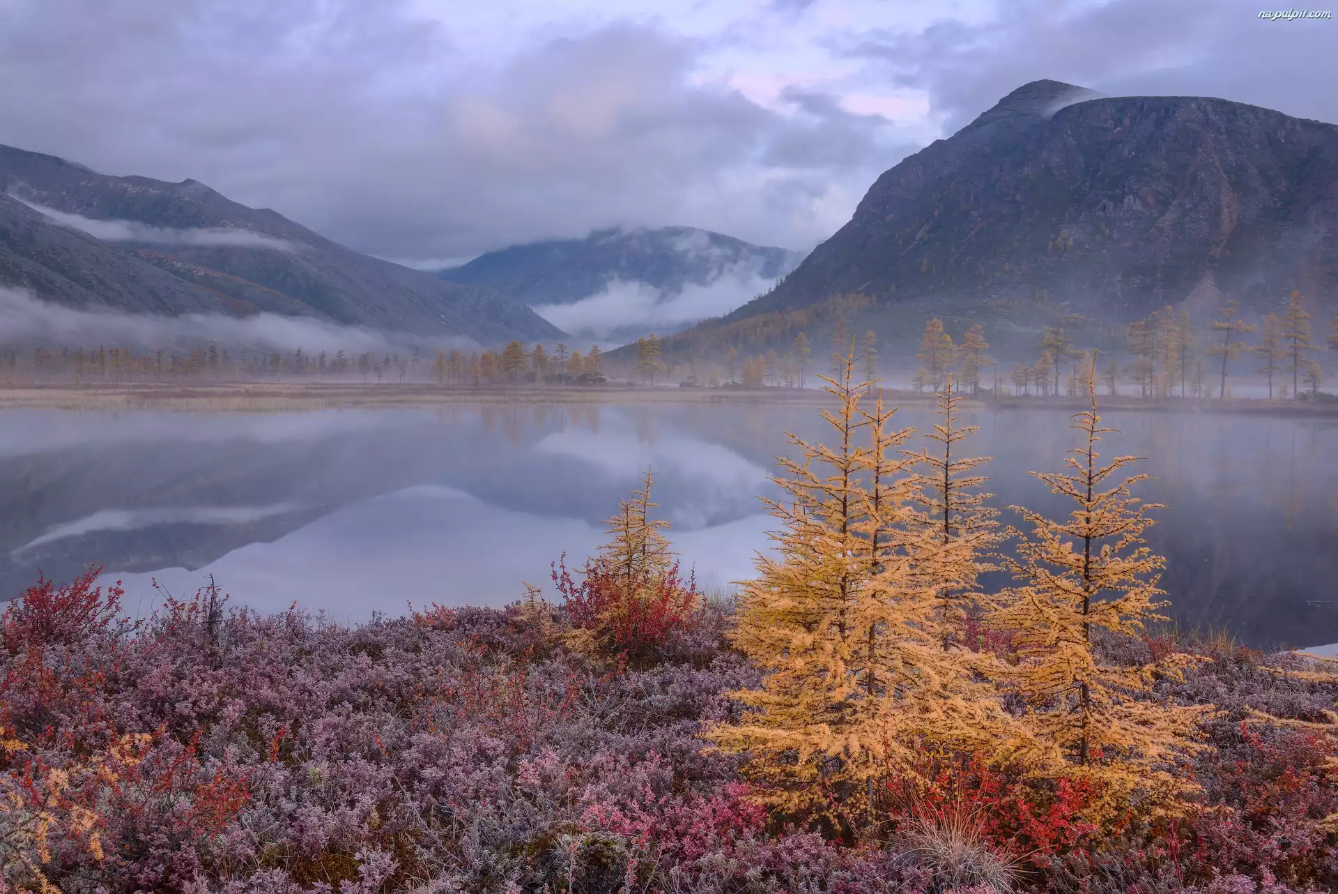 Jezioro Jack London, Rosja, Jesień, Drzewa, Góry Kołymskie, Obwód magadański Na Pulpit