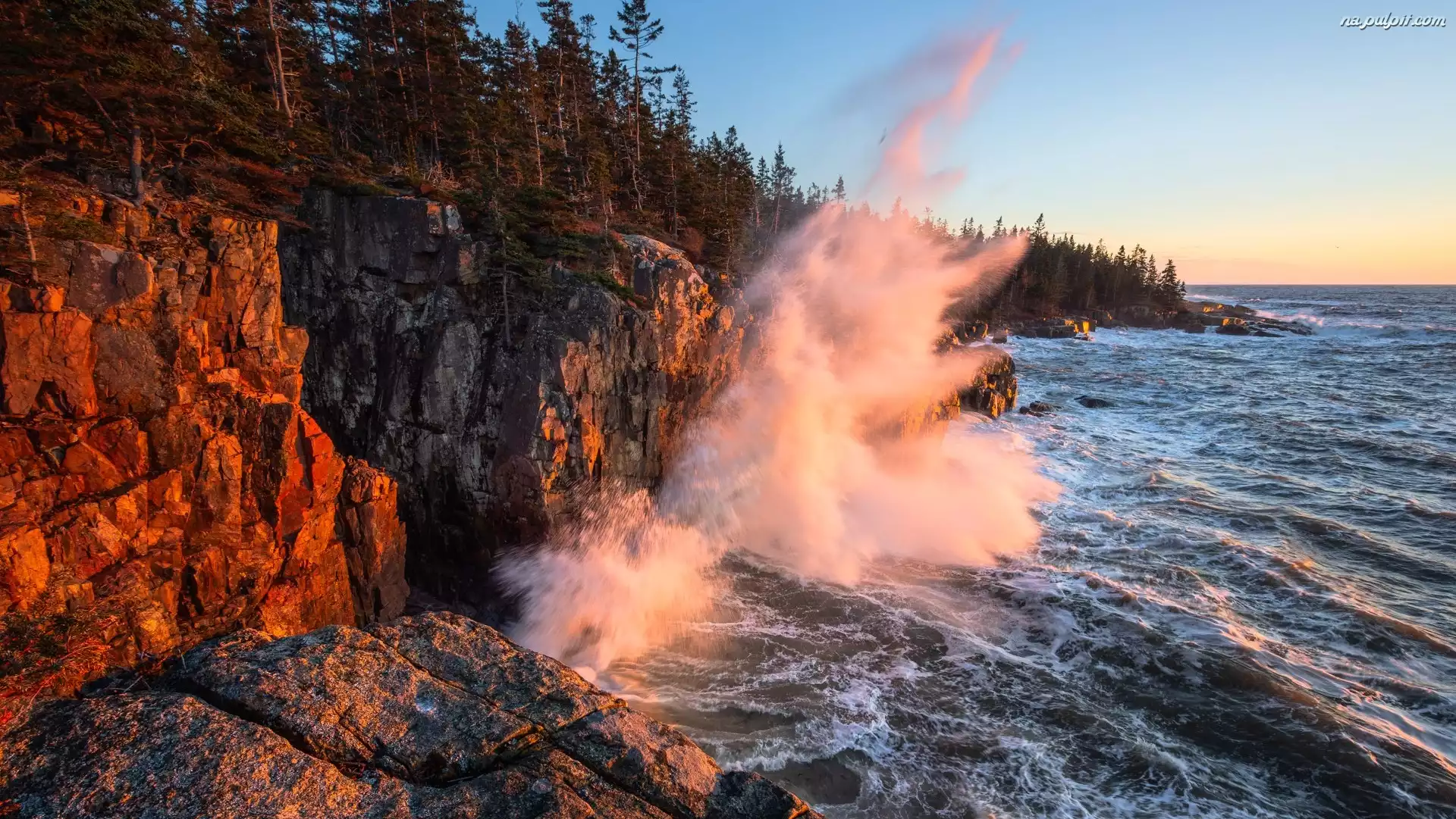 Maine, Morze, Drzewa, Park Narodowy Acadia, Skały, Stany Zjednoczone Na Pulpit