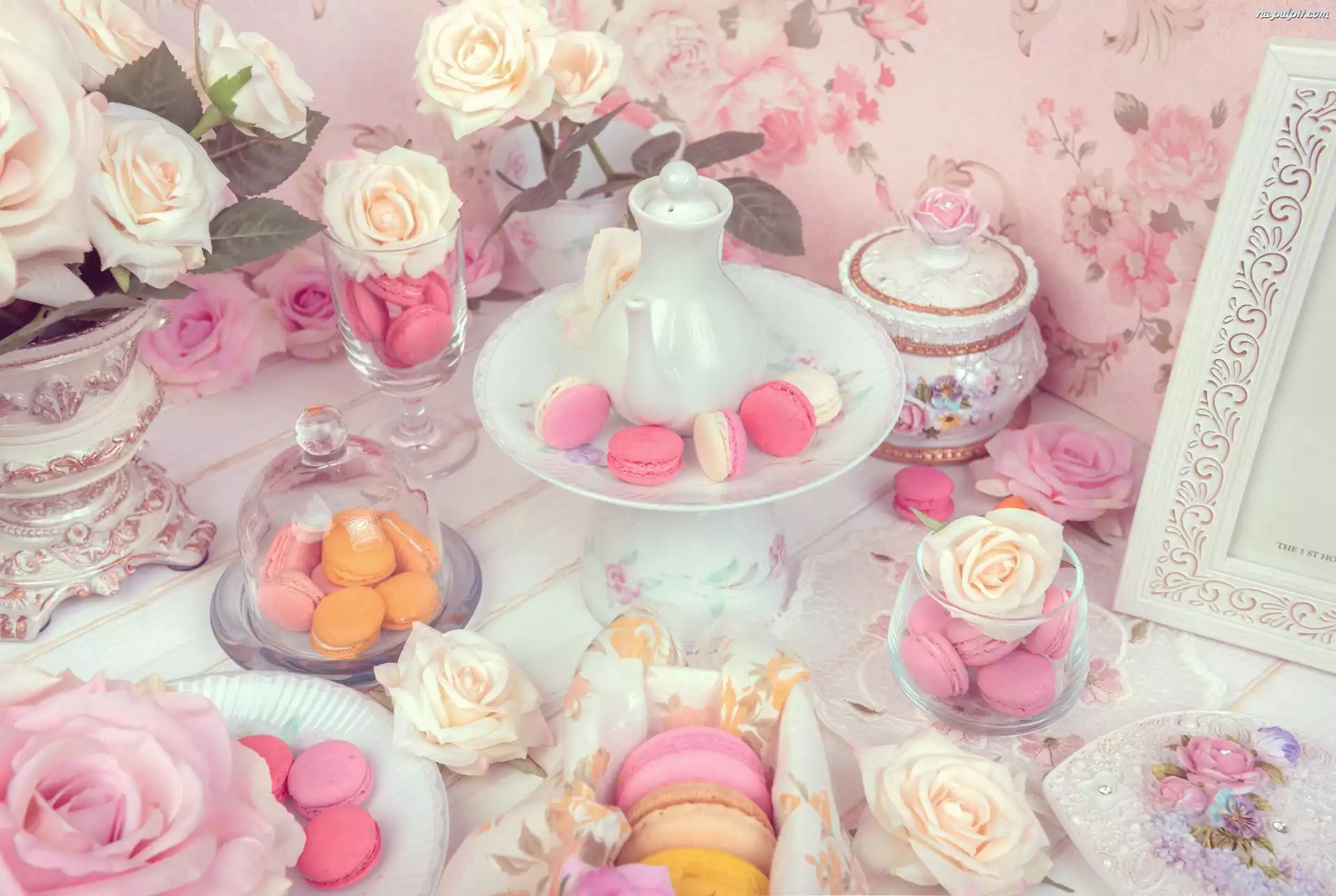 Wazon, Makaroniki, Pucharki, Kwiaty, Róże, Cukiernica, Ciasteczka, Ramka