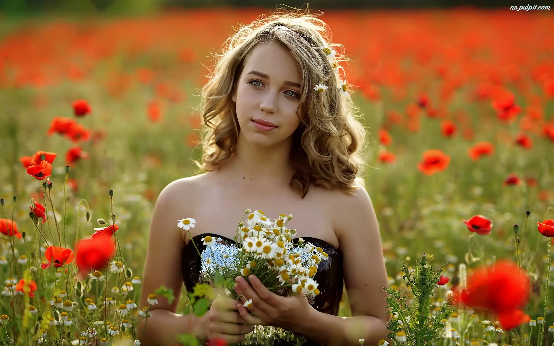 Blondynka, Maki, Rozmyte tło, Bukiet, Kobieta, Rumianki Na Pulpit