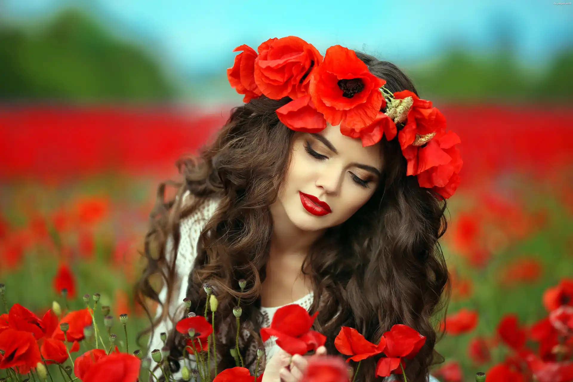 Makijaż, Maki, Kwiaty, Brunetka, Wianek Na Pulpit