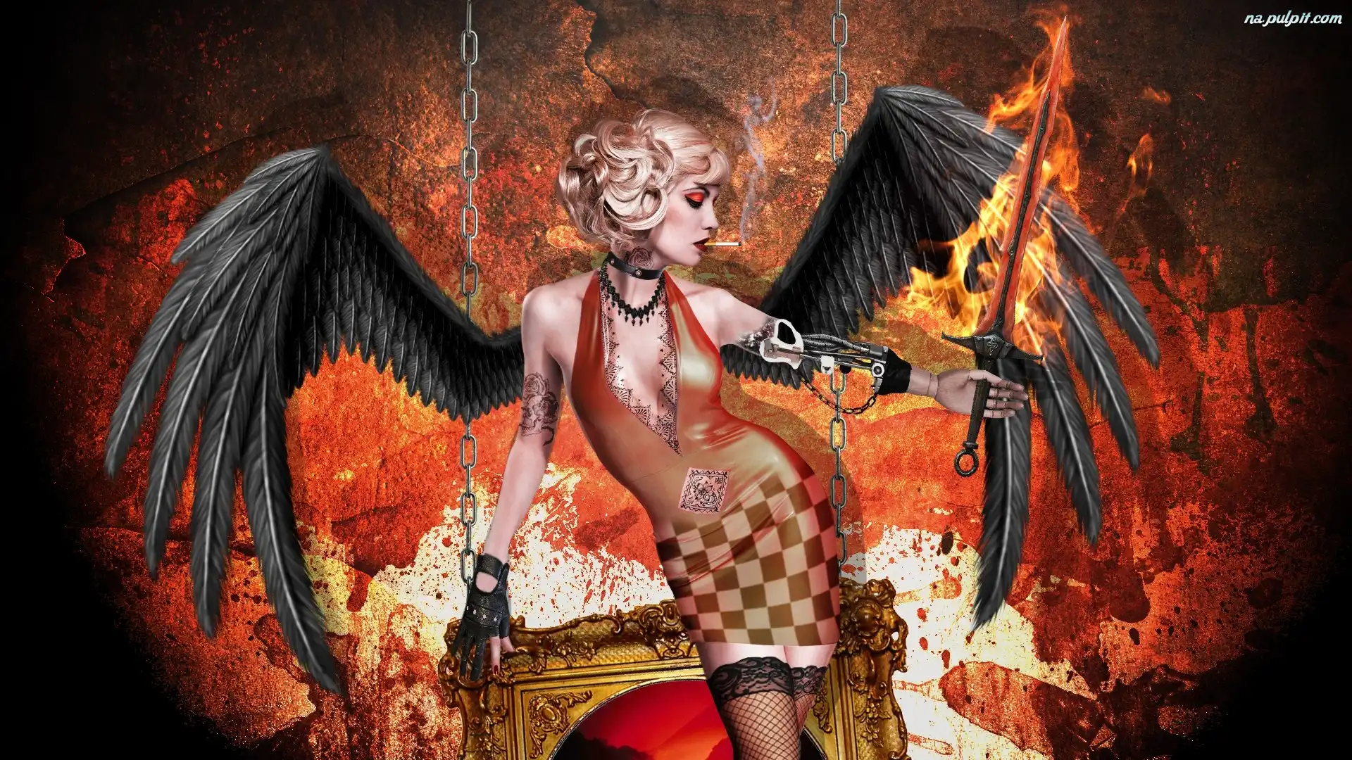 Makijaż, Skrzydła, Miecz, Tatuaż, Kobieta, Papieros Na Pulpit