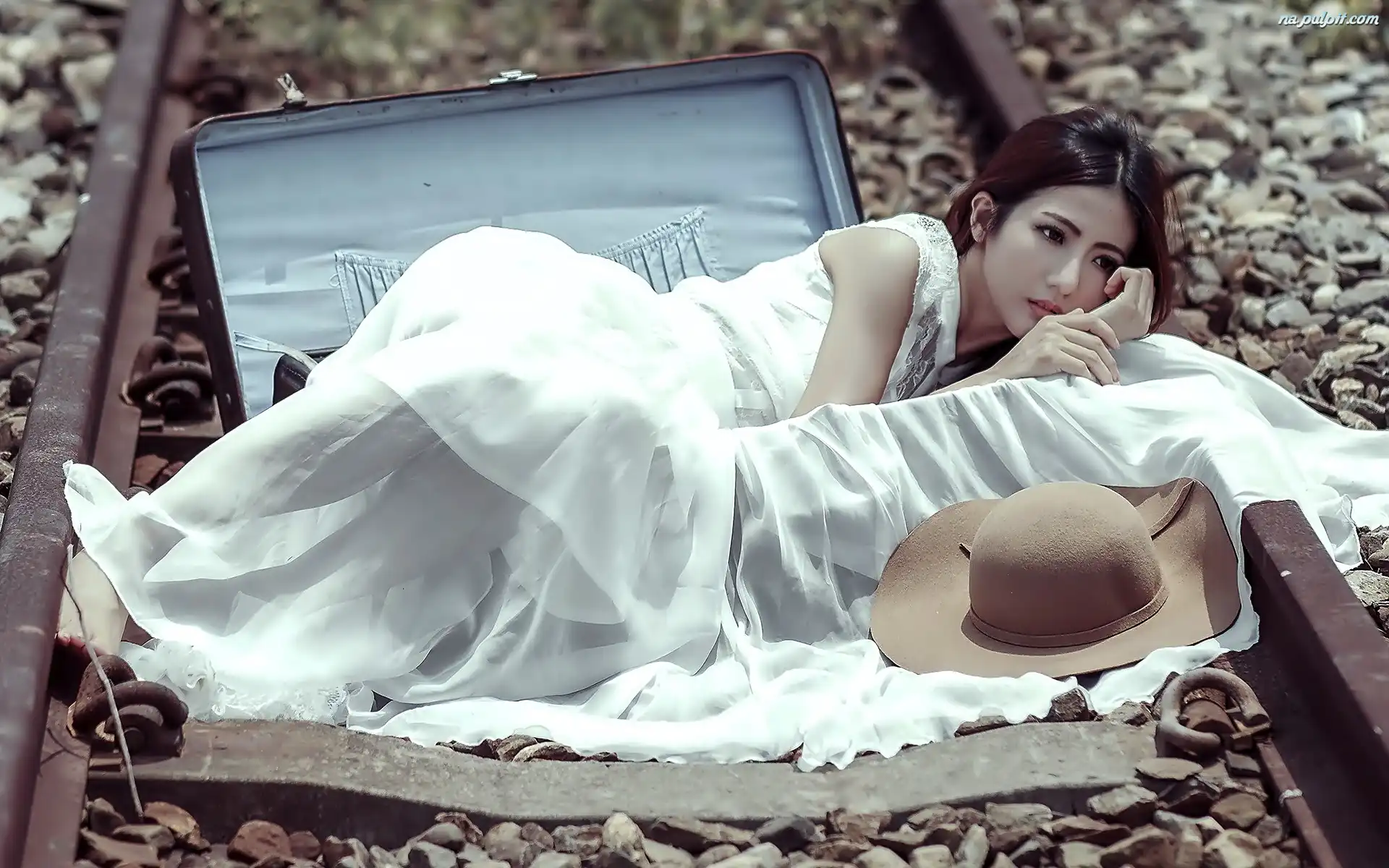 Makijaż, Kamienie, Tory, Walizka, Kobieta, Kapelusz