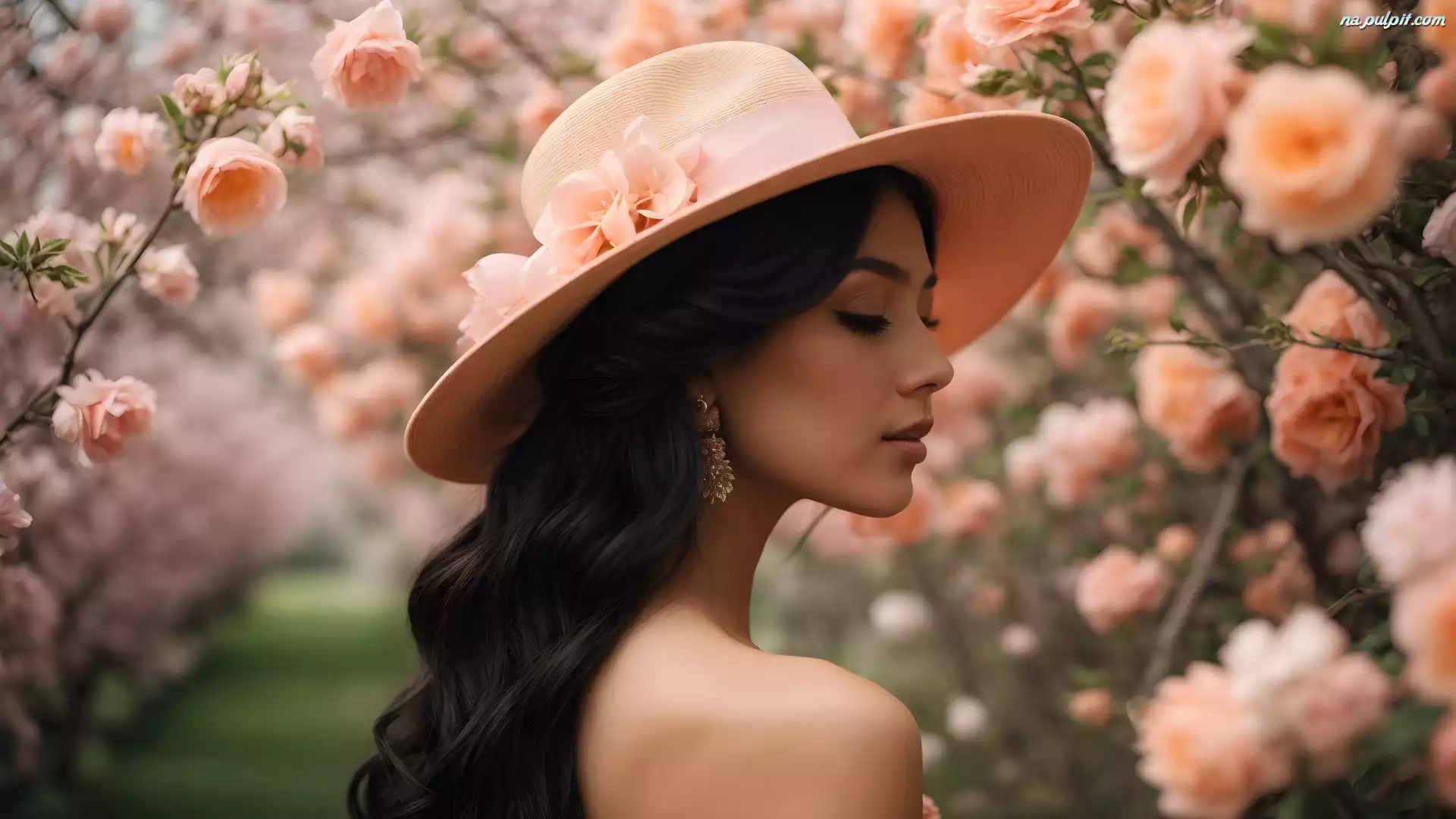 Kwiaty, Kobieta, Kapelusz, Makijaż, Brunetka, Kolczyki Na Pulpit