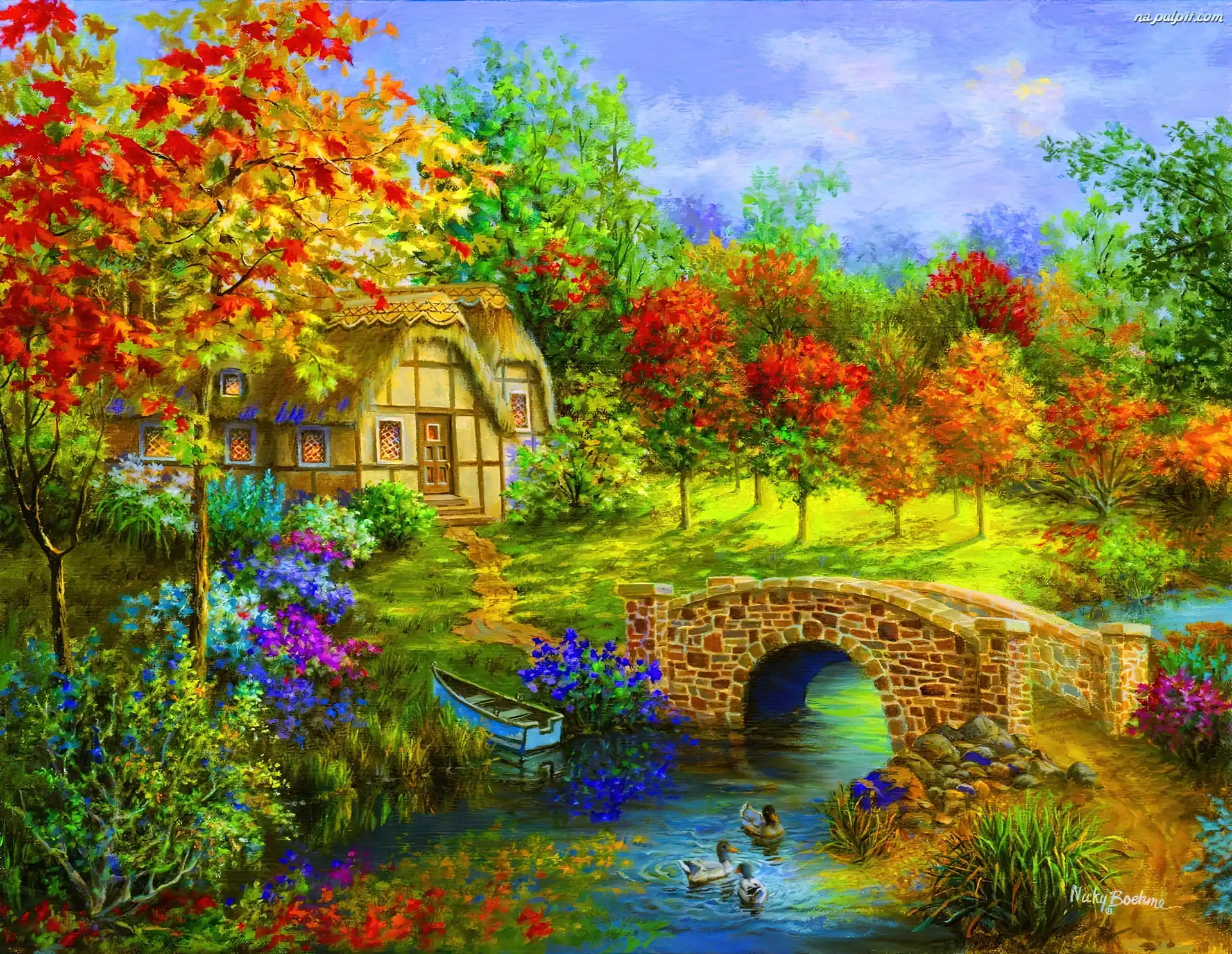 Malarstwo, Widoczek, Most, Domek, Jesień Na Pulpit