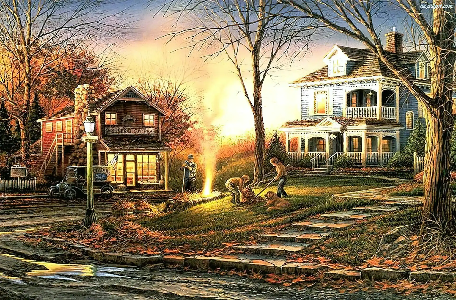 Malarstwo, Jesień, Domki, Widoczek Na Pulpit