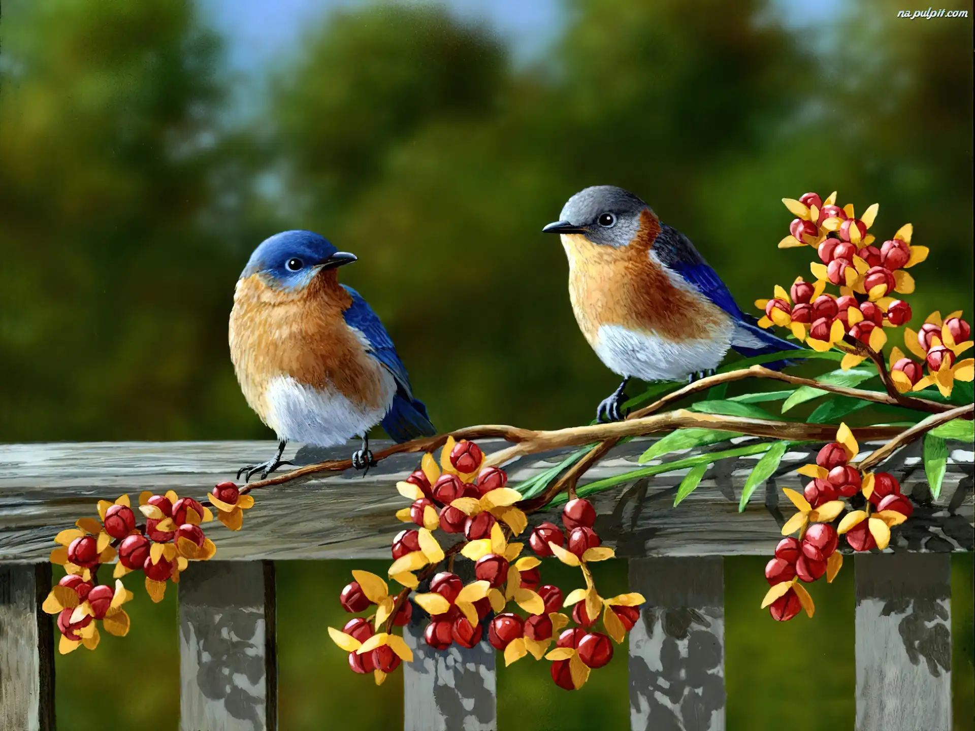 Malarstwo, Ptaki, Dwa, Kwiaty Na Pulpit