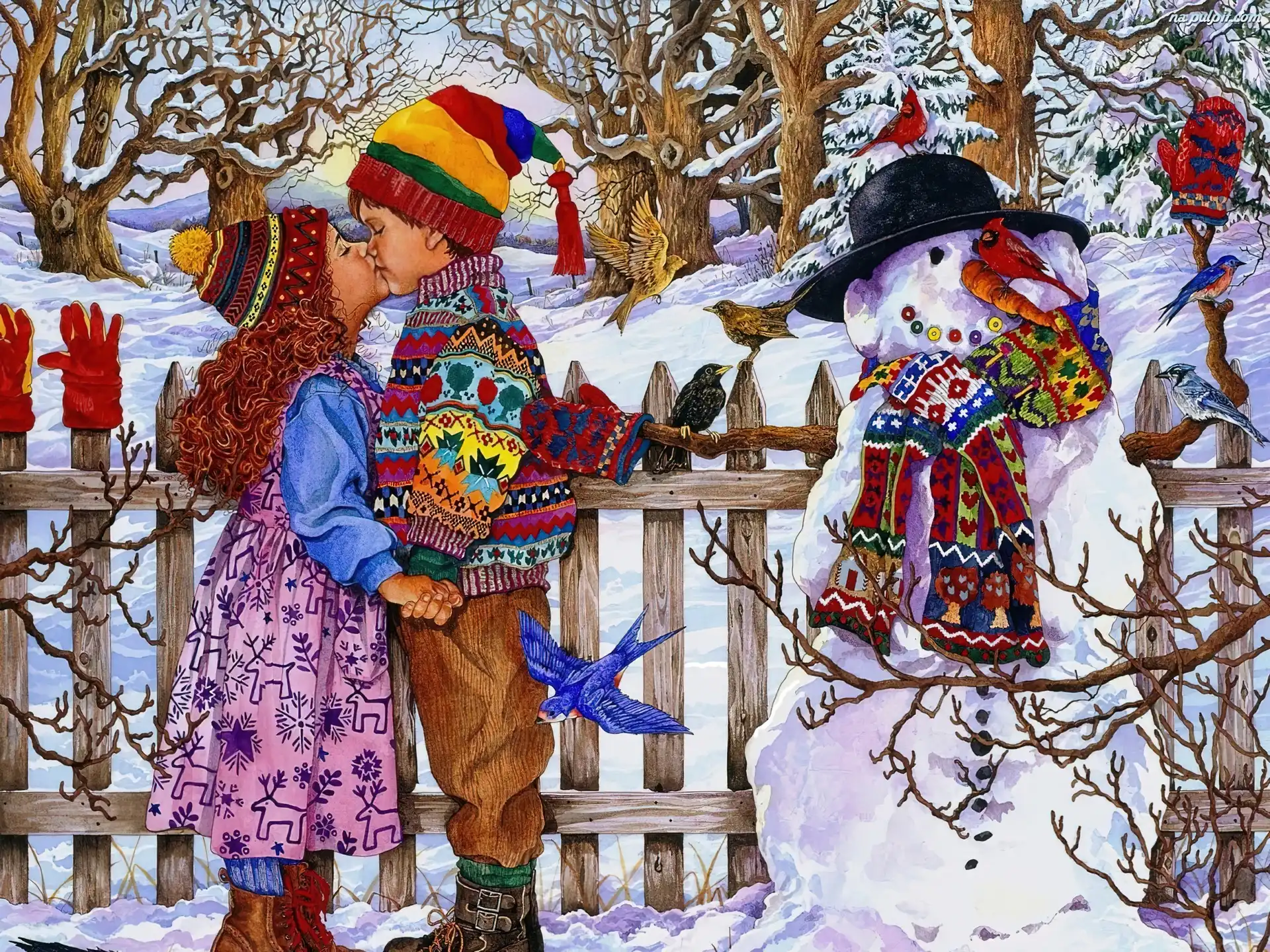 Malarstwo, Bałwan, Chłopiec, Dziewczynka, Zima Na Pulpit