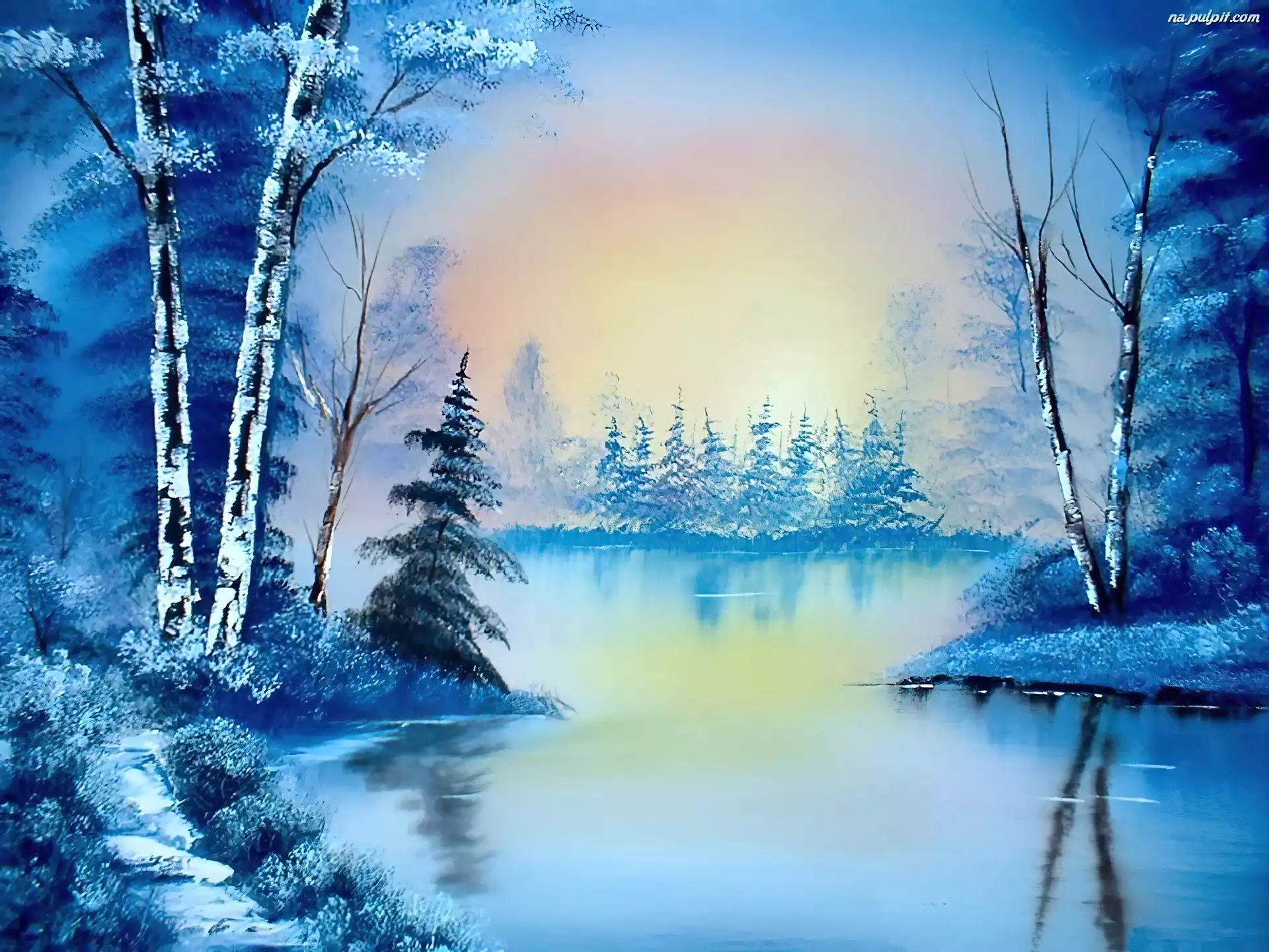Zima, Jezioro, Drzewa, Malarstwo, Choinki