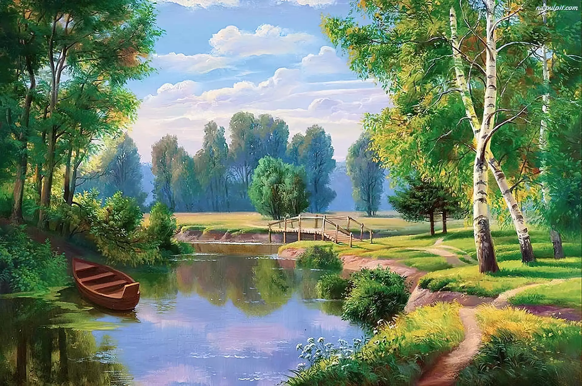Malarstwo, Drzewa, Łódka, Jezioro, Widoczek Na Pulpit