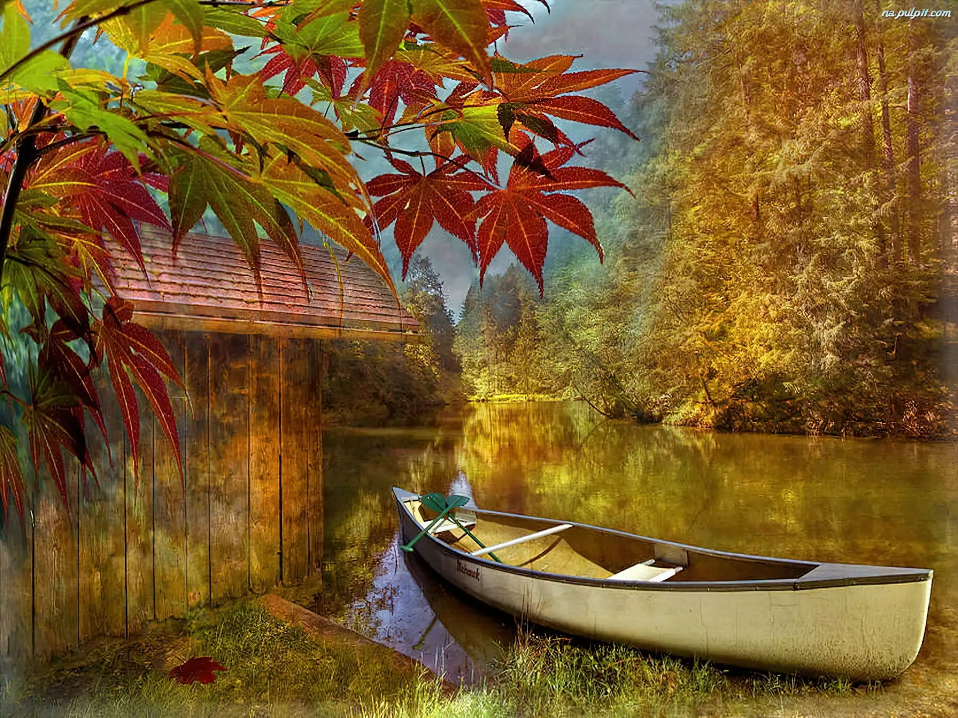 Malarstwo, Łódka, Jezioro, Liście