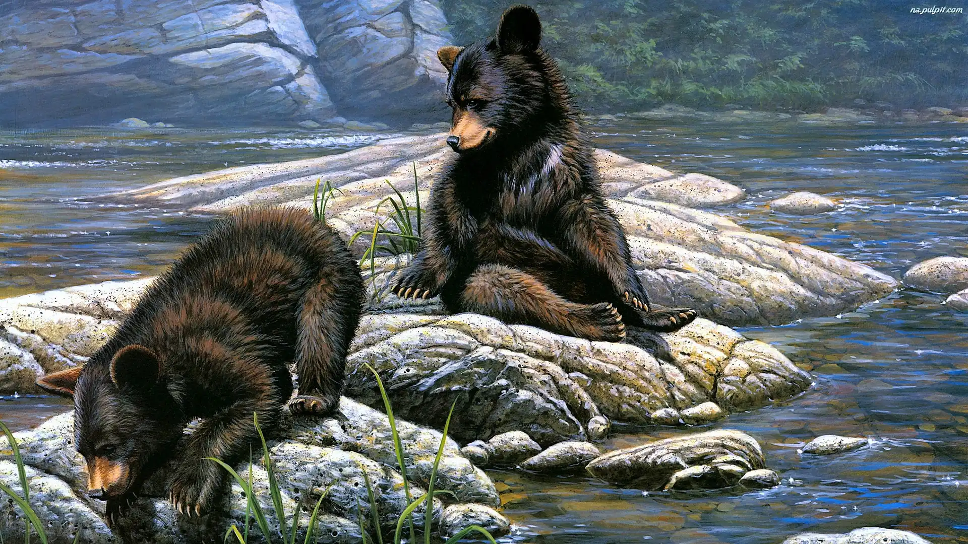 Paco Young, Niedźwiedzie czarne, Obraz, Rzeka, Skały, Dwa, Malarstwo Na Pulpit
