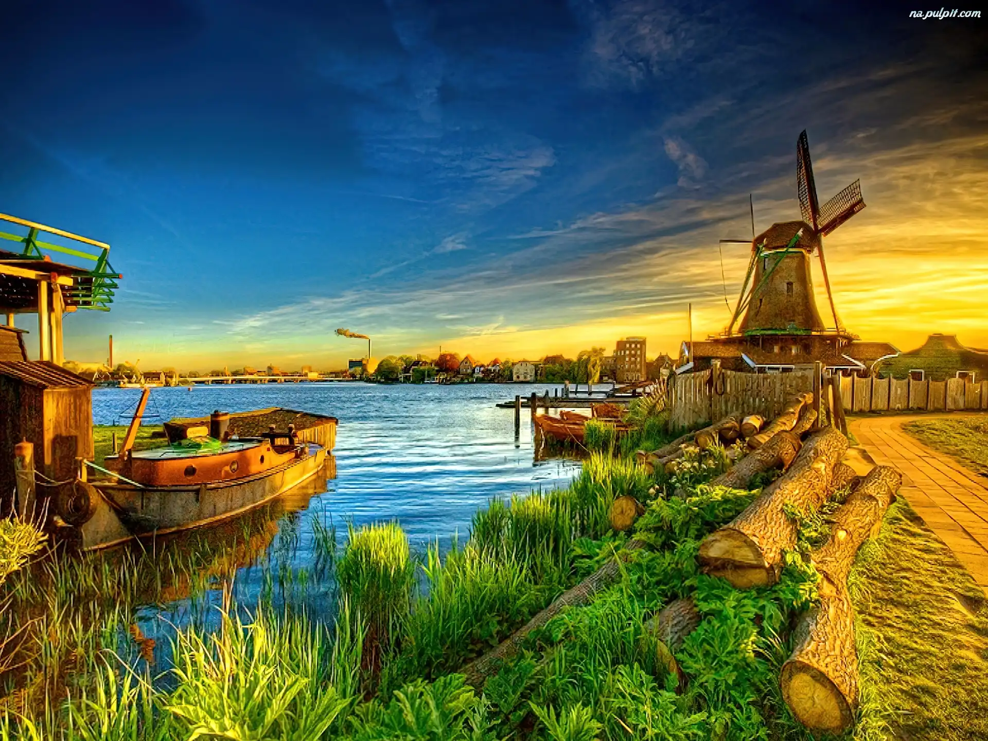 Malarstwo, Wiatrak, Rzeka, Widoczek Na Pulpit