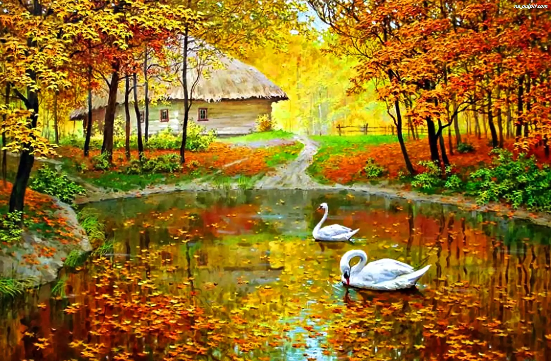 Malarstwo, Domek, Łabędzie, Staw, Jesień Na Pulpit