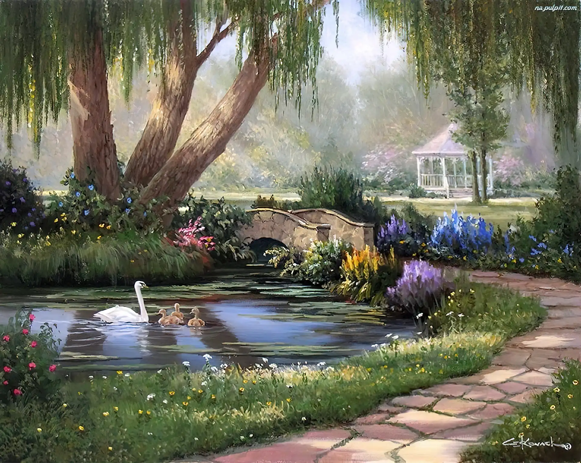 Malarstwo, Łabędzie, Staw, Widoczek Na Pulpit