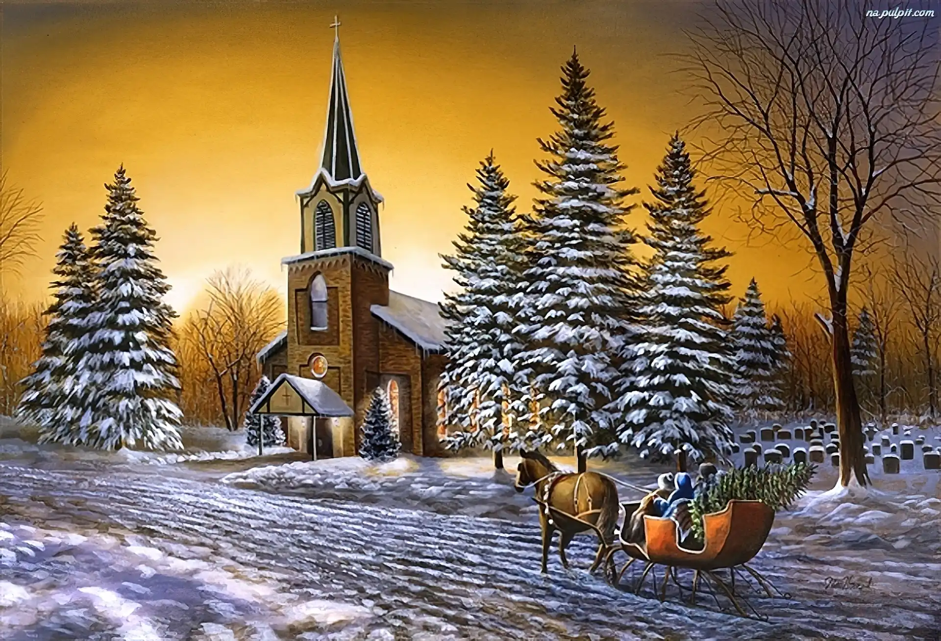 Malarstwo, Droga, Kościół, Zima, Sanie Na Pulpit