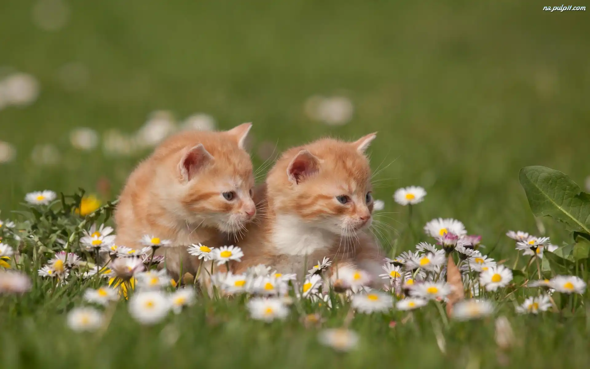 Małe, Stokrotki, Wiosna, Kotki, Słodkie, Łąka Na Pulpit