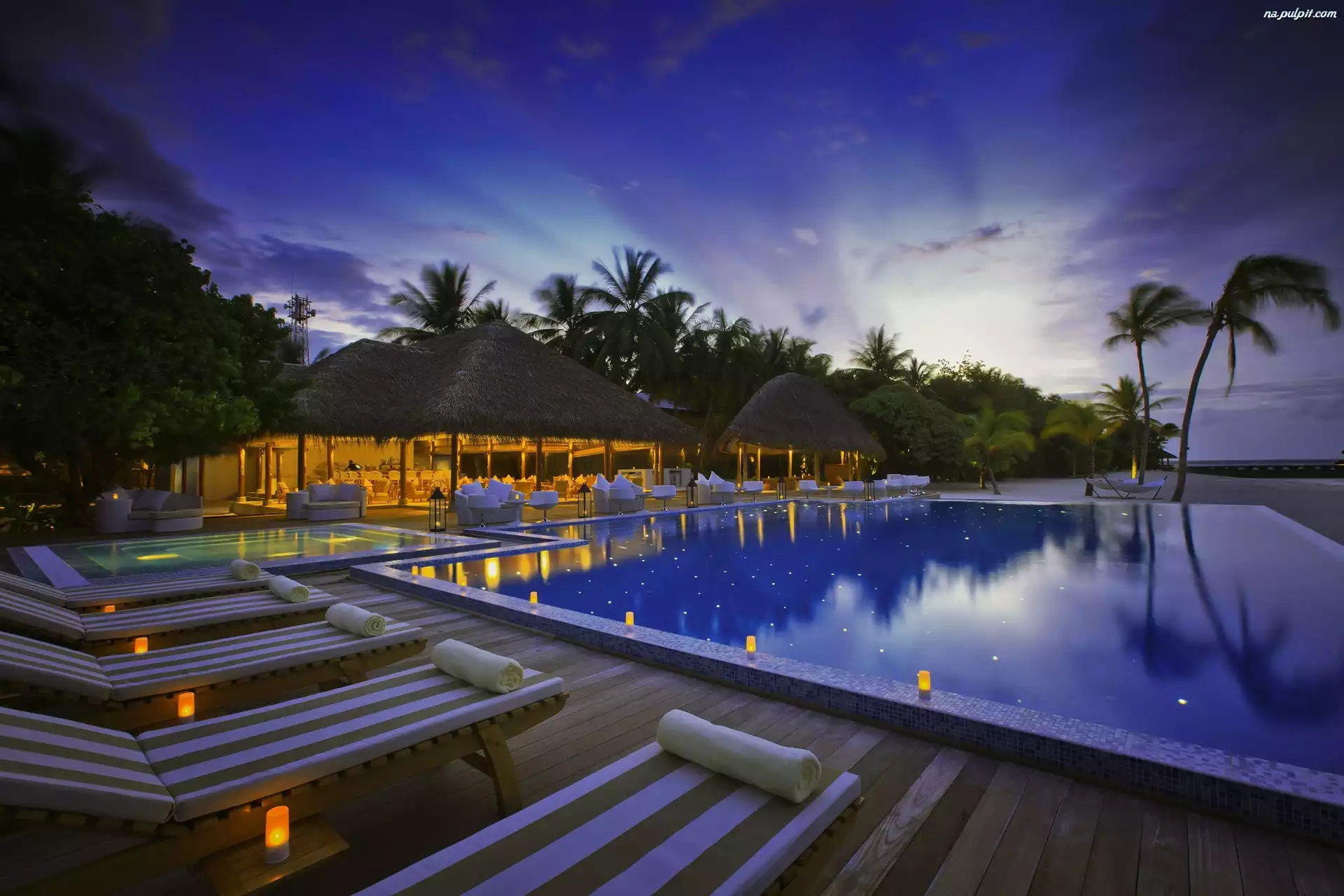 Restauracja, Palmy, Wakacje, Basen, Malediwy, Leżaki Na Pulpit